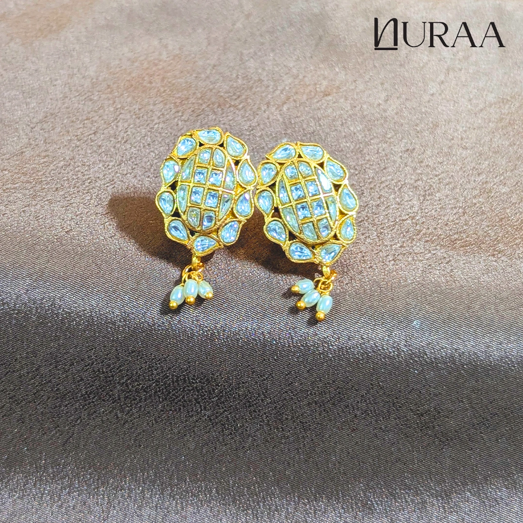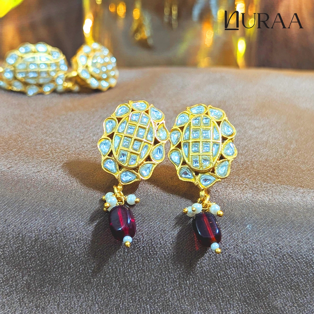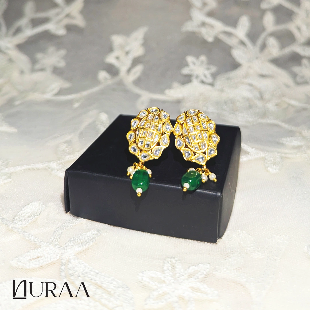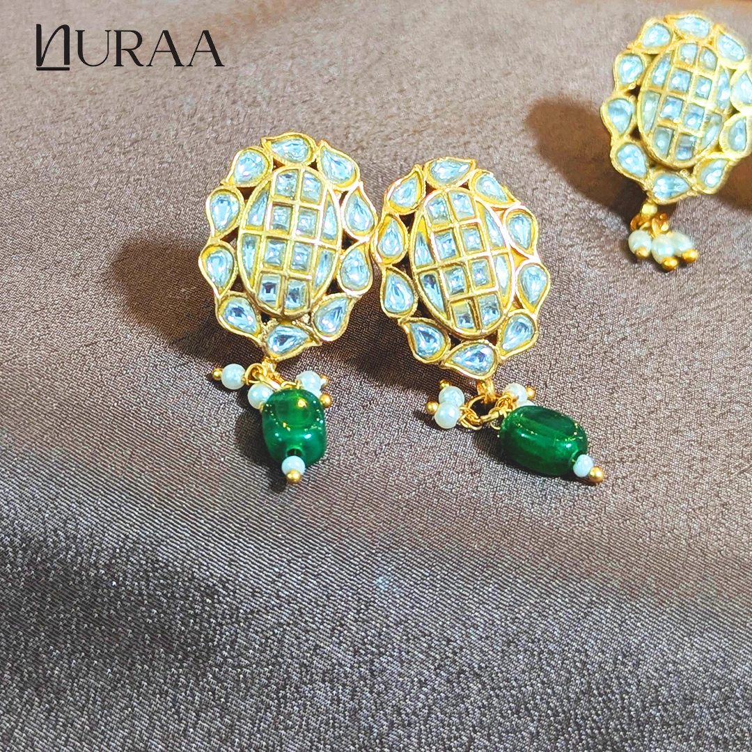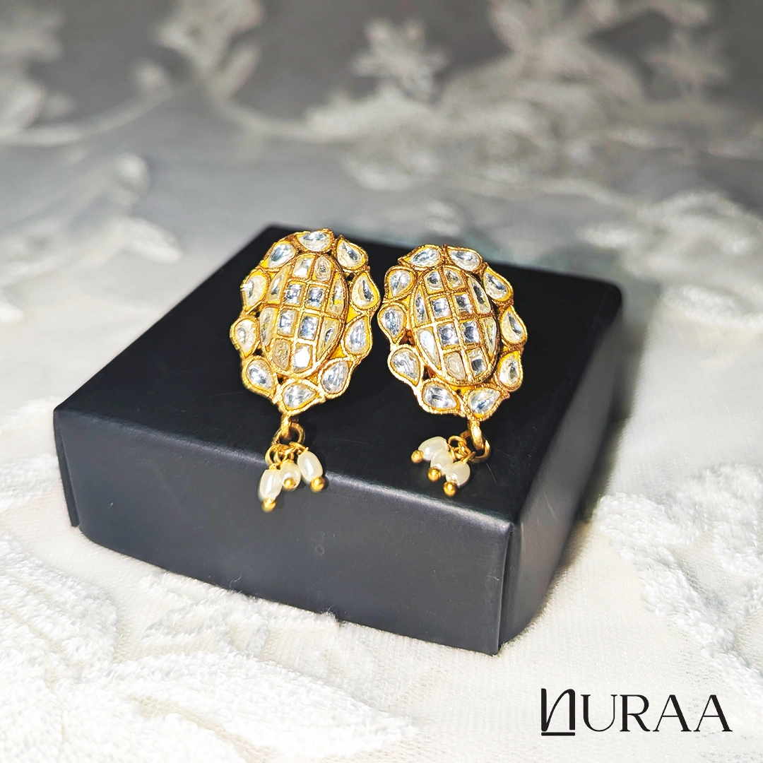 Step into timeless radiance with our Aarvi Polki Oval Earrings, a design that beautifully merges heritage craftsmanship with modern finesse. Each earring features a delicately carved oval frame encrusted with sparkling polki stones, arranged in intricate symmetry and finished with elegant dangling beads that add a touch of movement and grace.