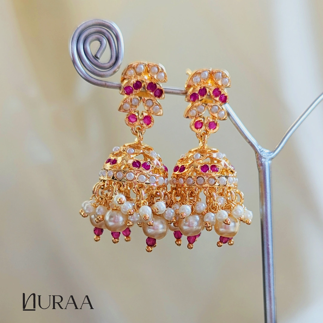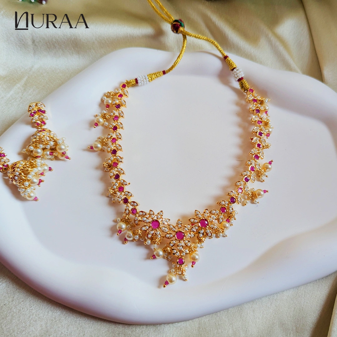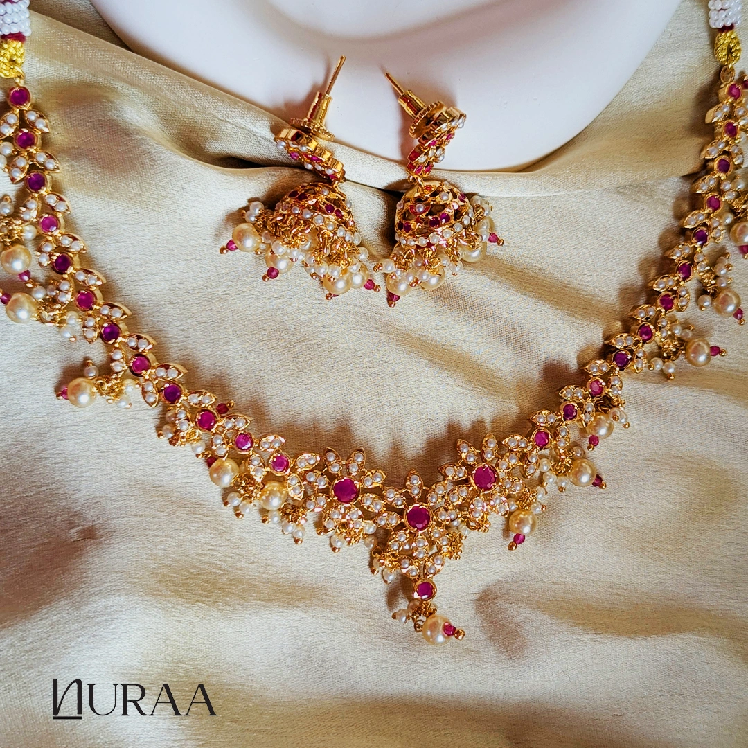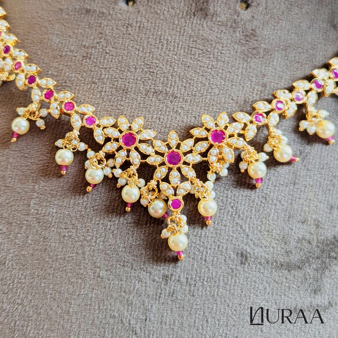 Anvika Ruby Pearl Necklace Set by NURAA is designed with delicate floral motifs and highlighted with rich ruby stones and soft pearl drops. The graceful detailing and elegant drop pattern give this set a luxurious yet lightweight feel. It is perfect for weddings, festive occasions, and traditional celebrations where timeless beauty matters.
