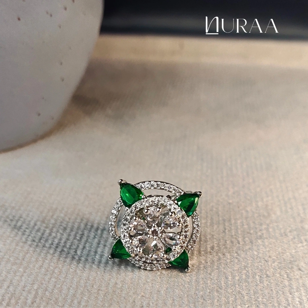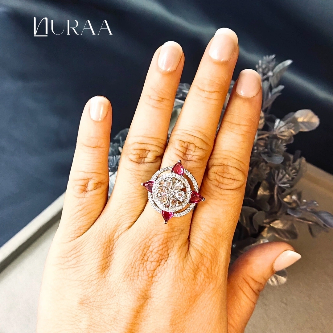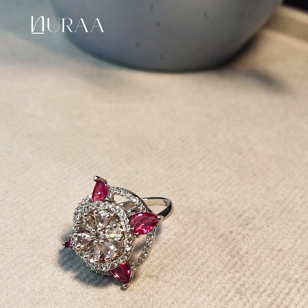Elevate your elegance with NURAA’s Aura Petal Ring, a dazzling blend of modern sparkle and floral charm. Designed around a brilliant central zircon cluster, this statement ring is accented with petal-shaped stones that add a pop of colour and sophistication. The open halo frame enhances the brilliance, making it the perfect cocktail, festive or everyday luxury piece.