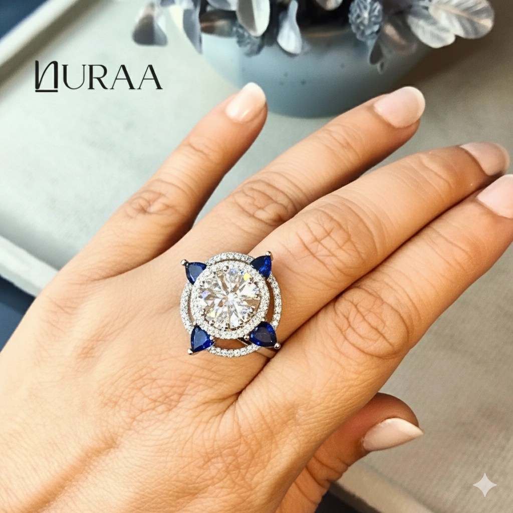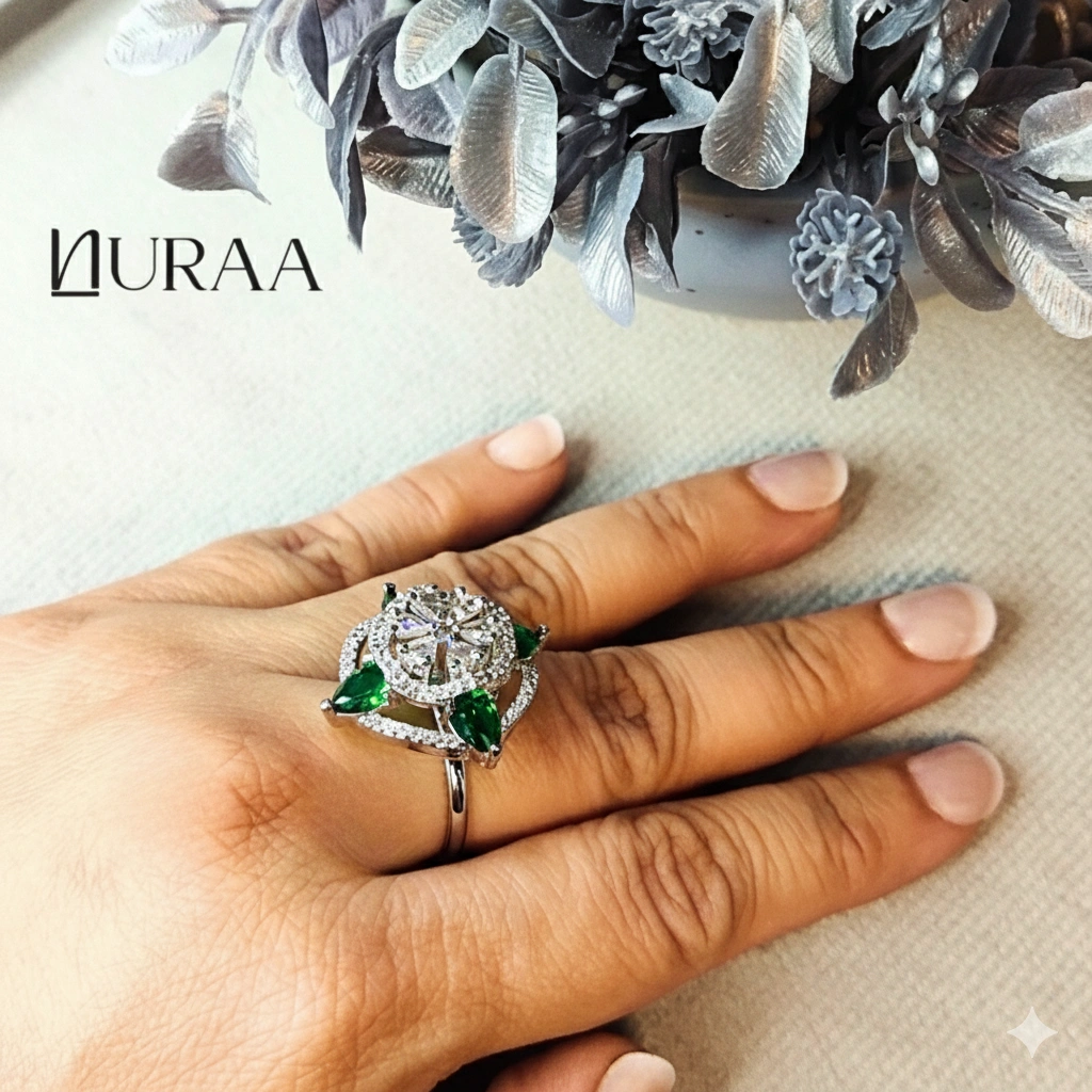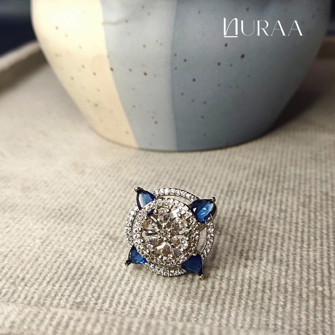 Elevate your elegance with NURAA’s Aura Petal Ring, a dazzling blend of modern sparkle and floral charm. Designed around a brilliant central zircon cluster, this statement ring is accented with petal-shaped stones that add a pop of colour and sophistication. The open halo frame enhances the brilliance, making it the perfect cocktail, festive or everyday luxury piece.