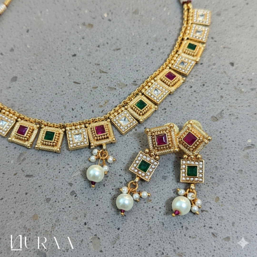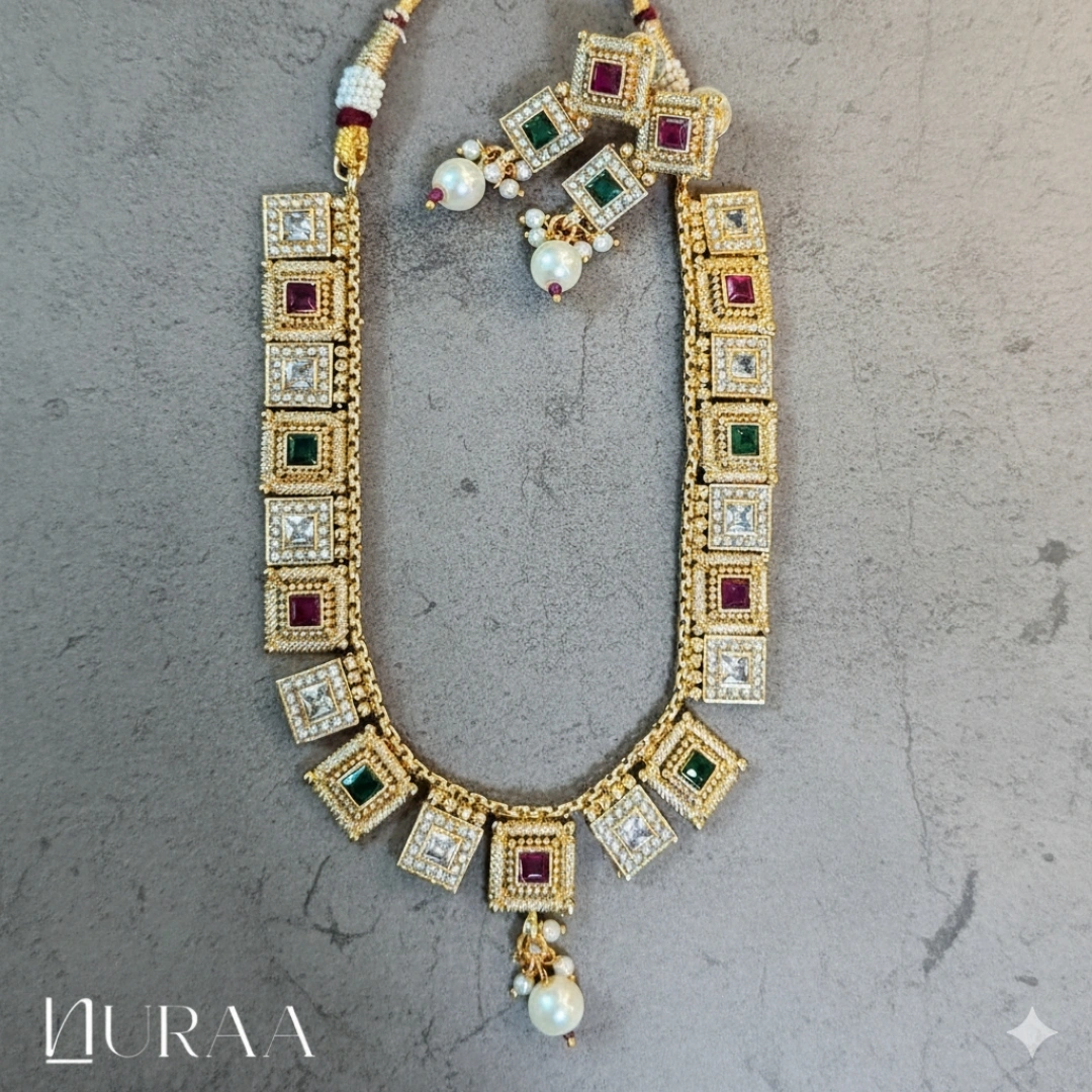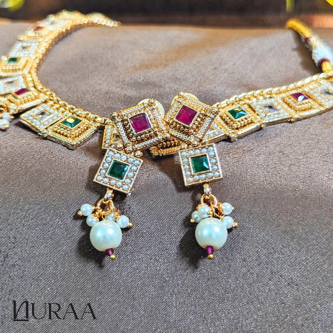 Embrace the essence of regal tradition with NURAA’s Aura Square Necklace Set, an exquisite blend of intricate craftsmanship and timeless beauty. Each square motif is adorned with ruby, emerald or polki-style stones, delicately framed in an antique gold setting that radiates royal charm. The necklace, paired with matching earrings embellished with lustrous pearls, adds a touch of sophistication and grandeur to every occasion.