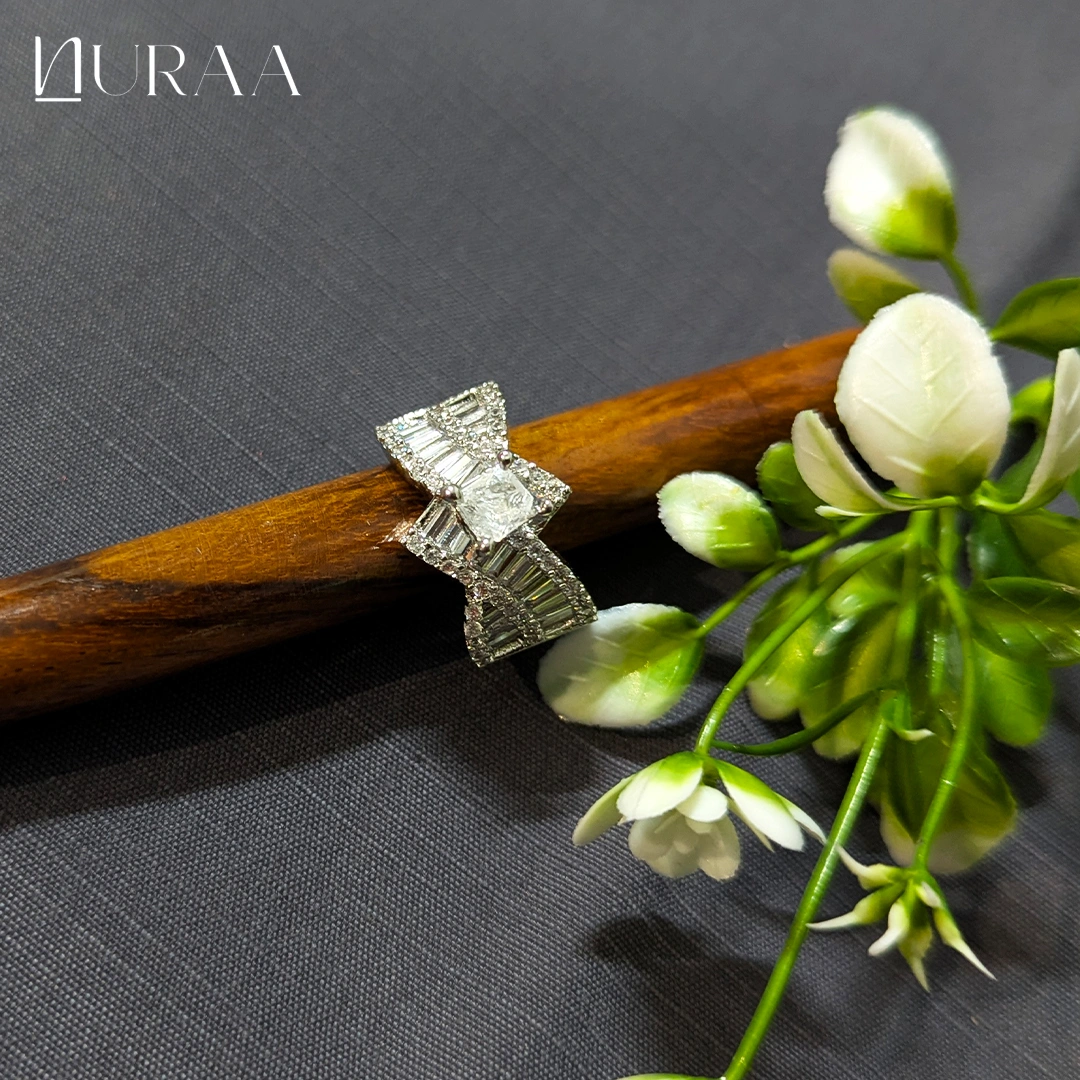 Experience the brilliance of a true statement piece with the Bow Solitaire Ring by NURAA. Designed to mirror the allure of high-end diamond jewellery, this elegant ring features a bold solitaire-style centerpiece flanked by meticulously channel-set baguette stones in a bow-inspired design. The precision-cut zirconia and flawless symmetry exude sophistication, making it an exquisite choice for special occasions or evening elegance.