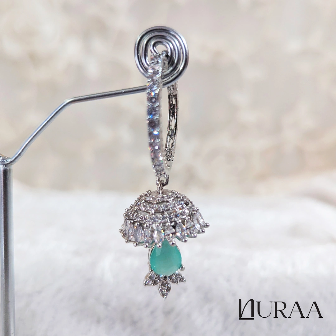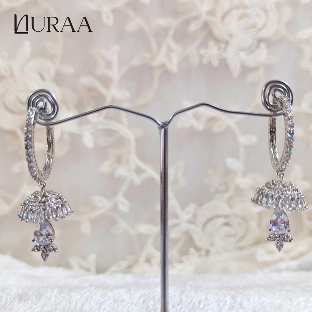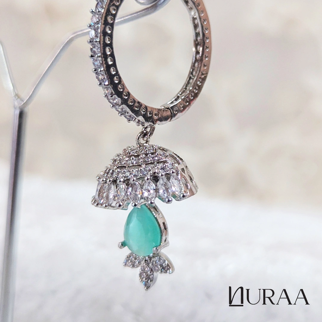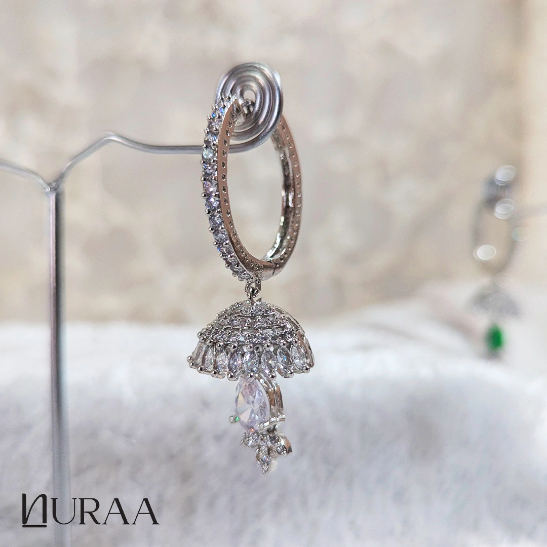 Elevate your festive elegance with the Crystal Dew Jhumki Earrings by Nuraa, crafted in a radiant silver finish and designed to sparkle from every angle. These exquisite earrings feature a zircon-encrusted hoop, a beautifully detailed dome jhumki, and a luminous teardrop stone that adds the perfect pop of colour.