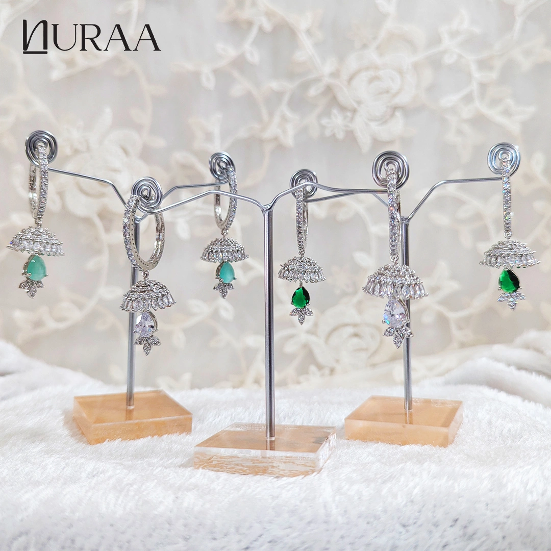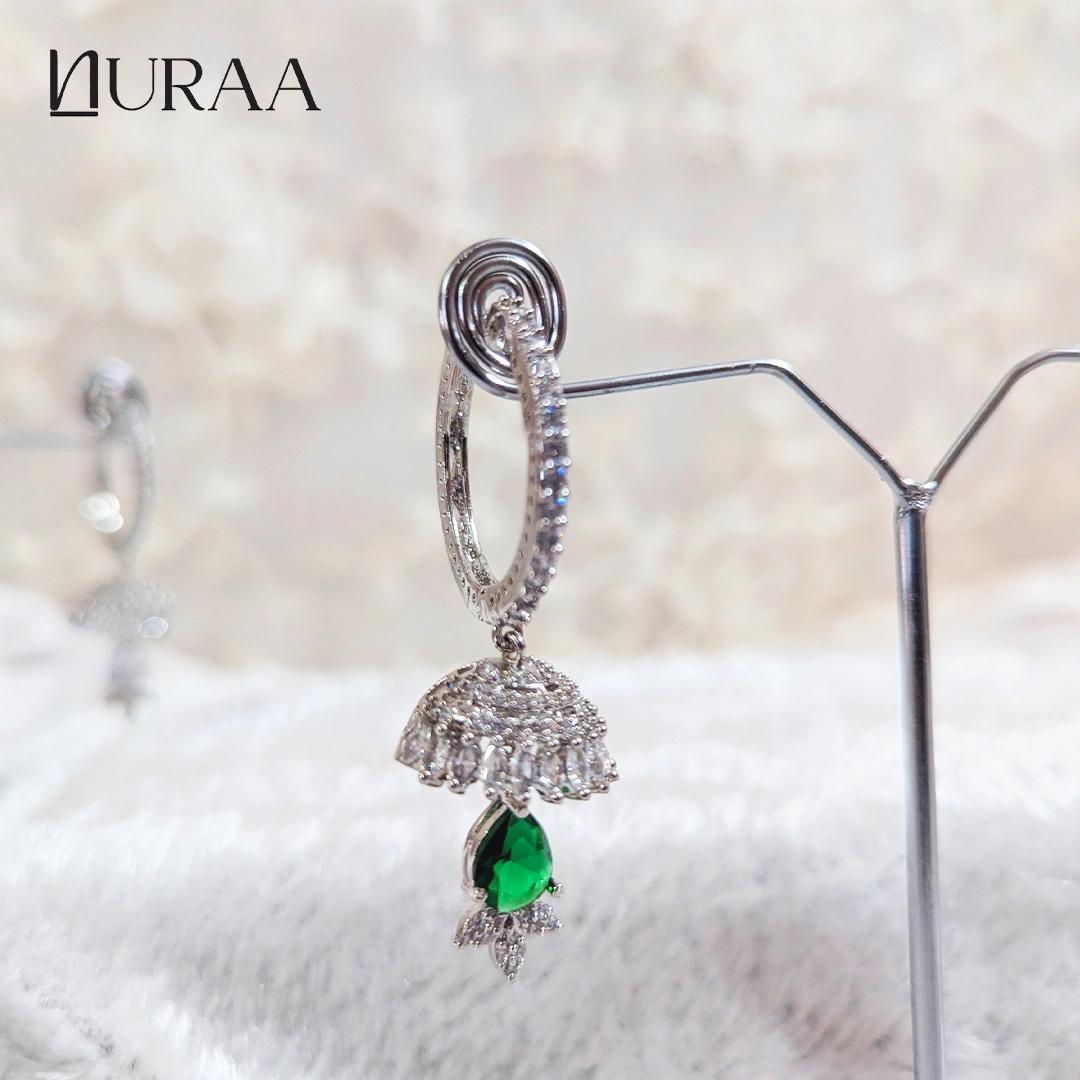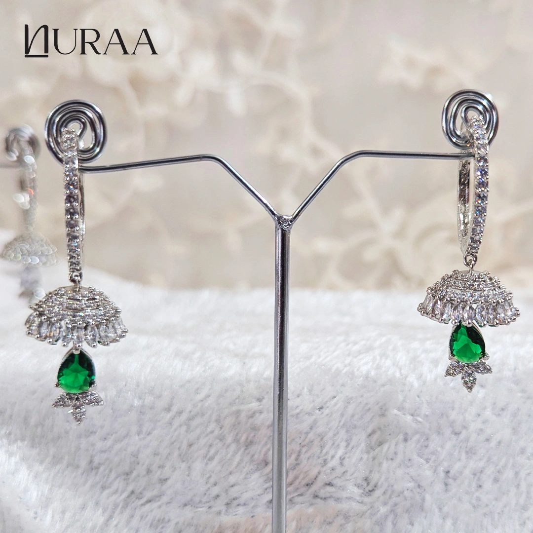 Available in three stunning variants—White Crystal for a timeless and graceful glow, Mint Green for a soft and refreshing charm, and Emerald Green for a rich, regal statement—each pair brings its own unique personality to your look. Delicately finished with a sparkling leaf cluster at the base, this design is perfect for weddings, festivities or any moment that calls for a touch of brilliance.