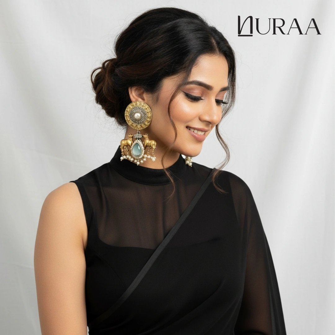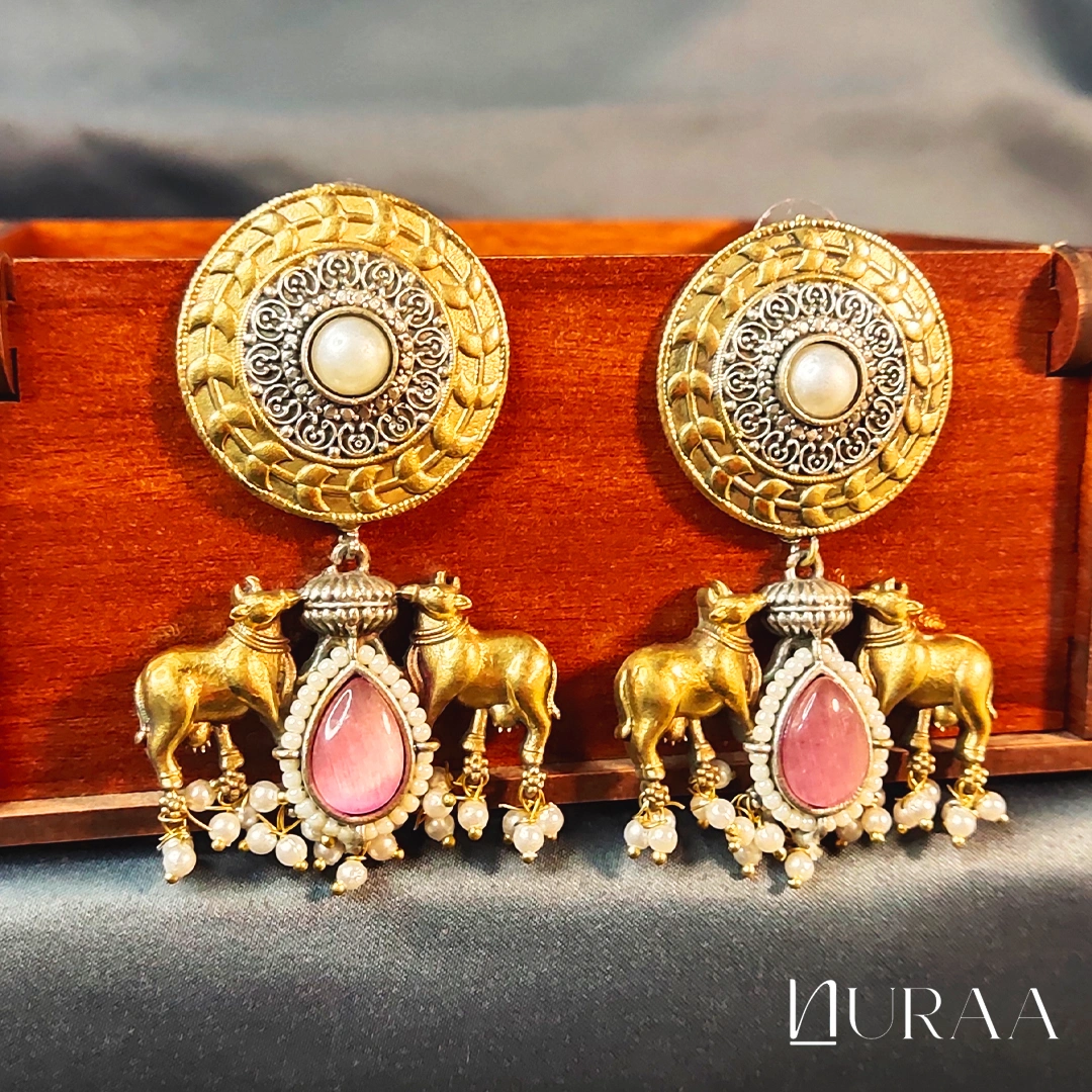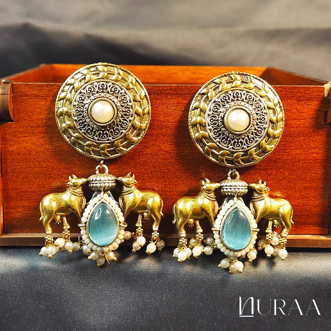 These beautifully crafted Dual-Tone Cow Motif Earrings blend antique gold and oxidised silver for a rich & traditional look. The round engraved stud is accented with a pearl, while the bottom features a pair of ornate cow motifs—symbolising purity and heritage. A teardrop cabochon stone (Sky Blue / Onyx Black / Rose Pink) sits at the centre, finished with delicate pearl drops for added elegance.