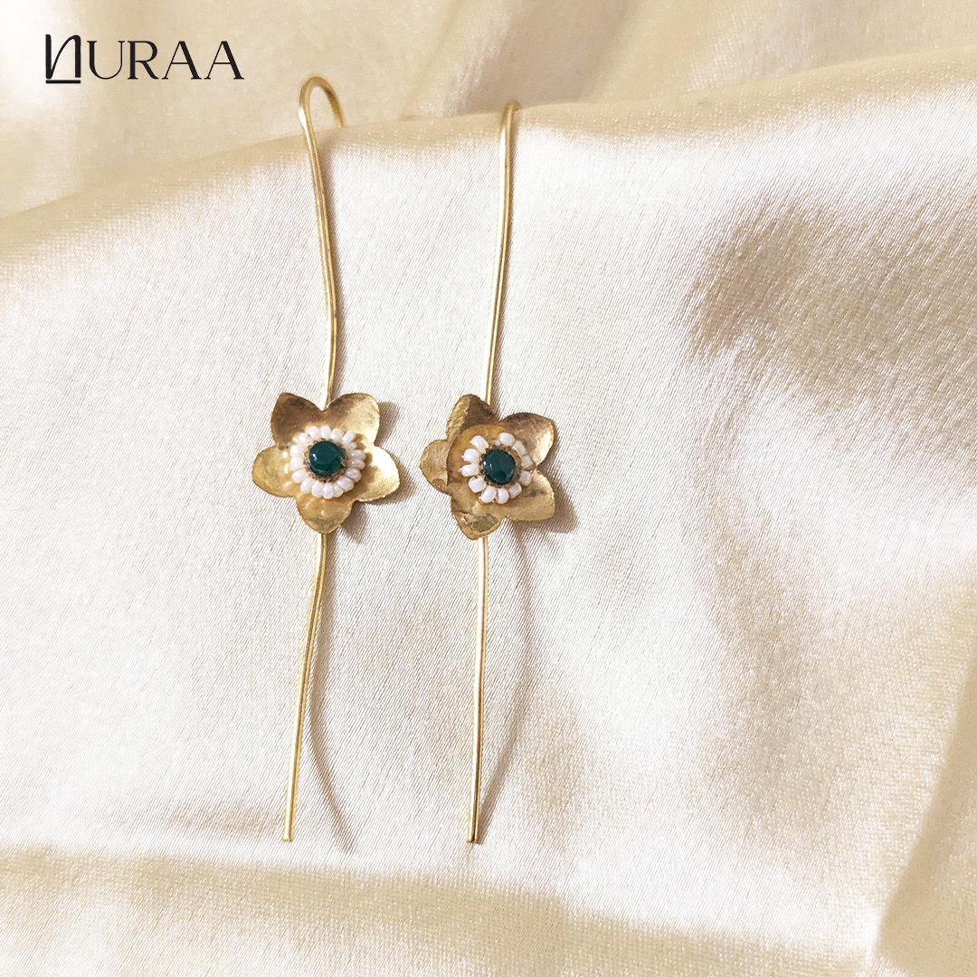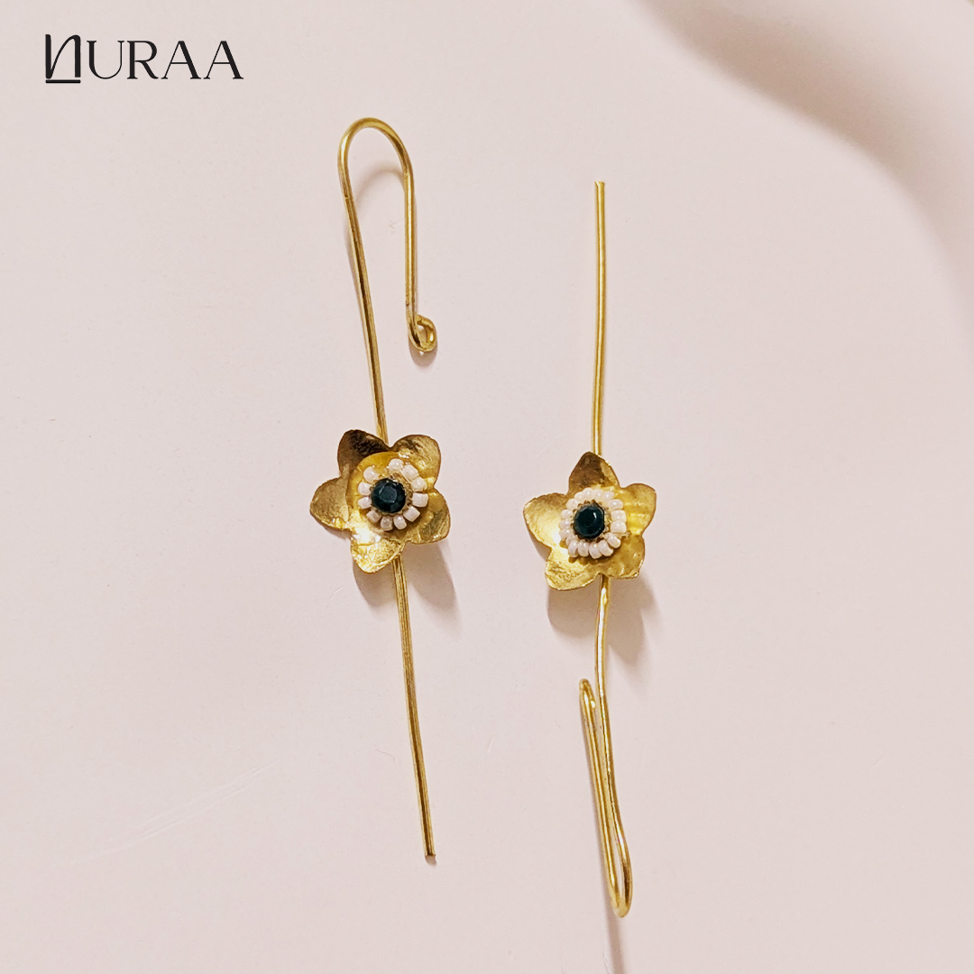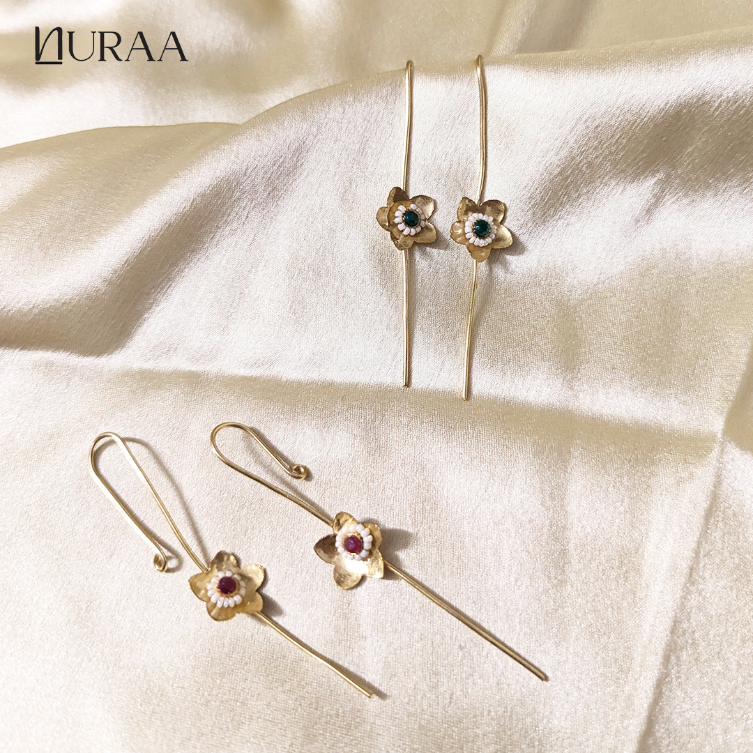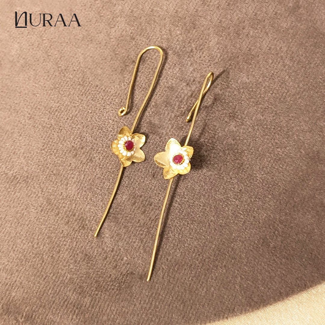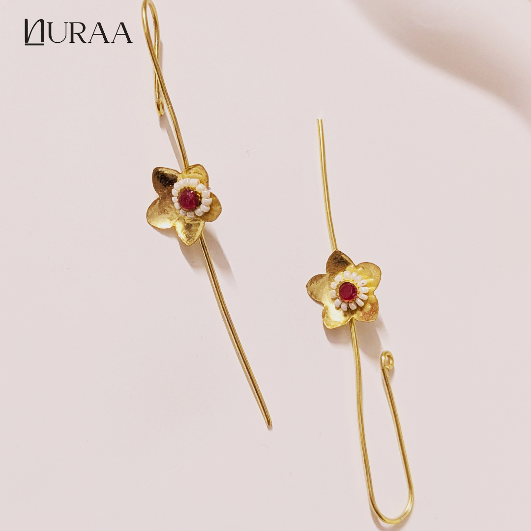 Grace meets minimalism in the Elara Floral Ear Pins by NURAA. Designed with a sleek gold-toned elongated hook and finished with a delicate handcrafted floral motif, these ear pins celebrate understated elegance. The tiny bloom, adorned with green & red and pearl detailing, adds just the right touch of charm without overpowering your look.