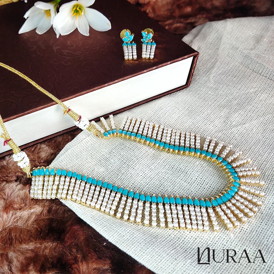 Embrace timeless elegance with the Flexi Pearl Grace Necklace Set by NURAA. Handcrafted with smooth red coral and turquoise blue stones, paired with rows of luminous pearls, this flexi design reflects a perfect blend of tradition and sophistication. The intricate detailing and radiant gold polish make it an ideal choice for festive, wedding, or ethnic occasions. Complete with coordinating earrings, this set adds a graceful pop of colour and charm to any attire.