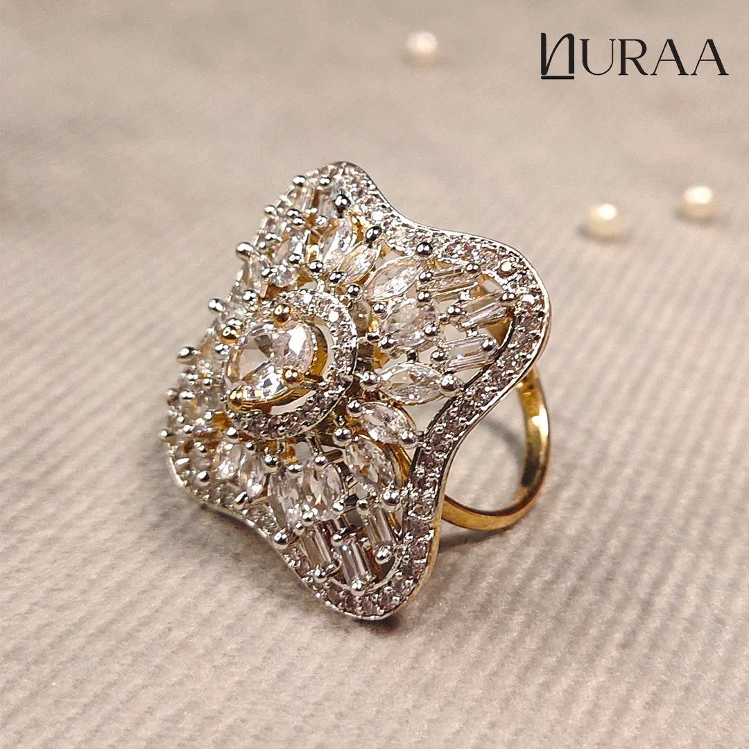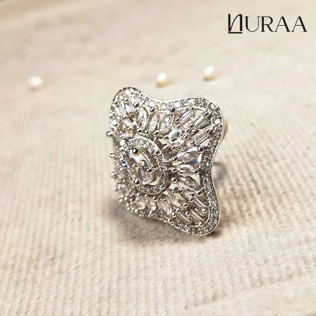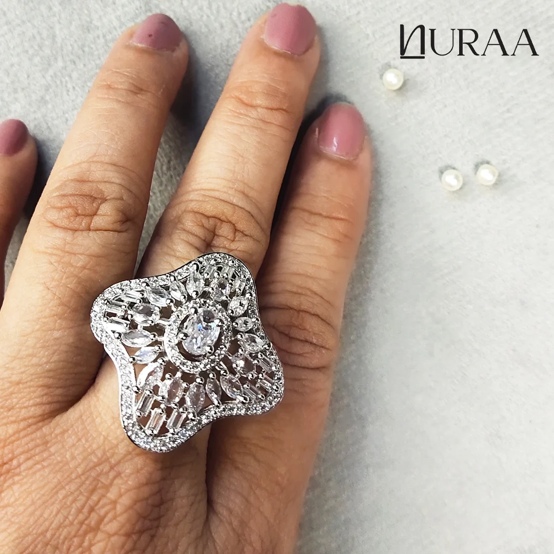 Elevate your elegance with the Floret Zircon Ring by NURAA — a breathtaking fusion of sparkle, structure and sophistication. Designed in a unique soft-square floral silhouette, this ring dazzles with an array of high-grade zirconia stones arranged in a radiant burst around a brilliant centrepiece.