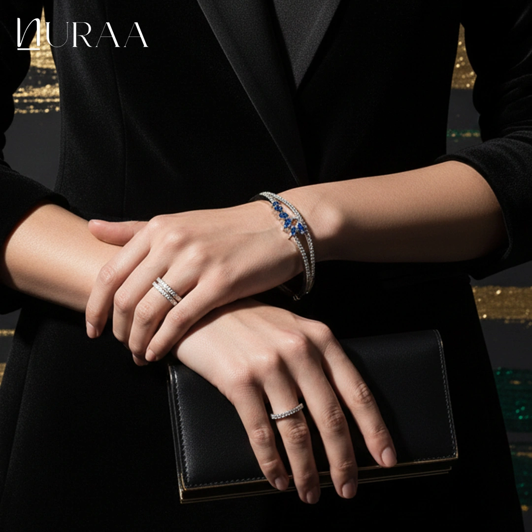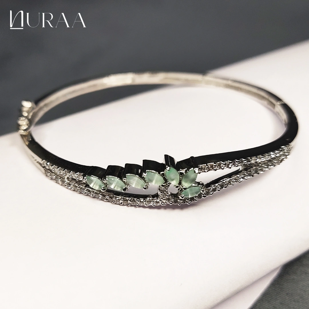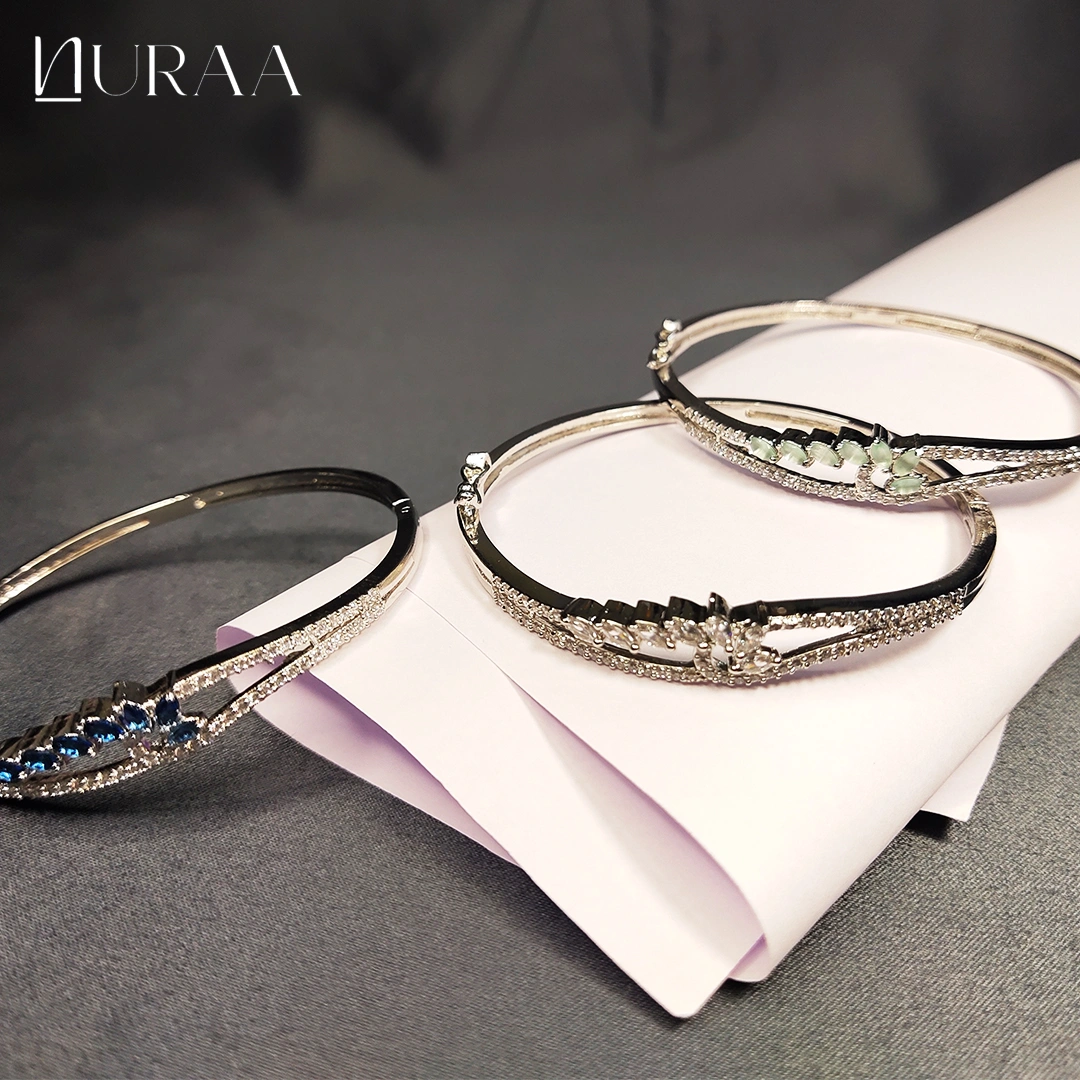 Redefine everyday elegance with the Gleam Classic Bangle Bracelet by NURAA. Designed with a slim, contemporary silhouette, this bracelet features a line of sparkling zircons accented with delicate colored stones for a subtle yet striking appeal. Available in three elegant color variations — Sapphire Blue, Mint Green and Crystal White — it is the perfect accessory for both casual sophistication and evening glamour.