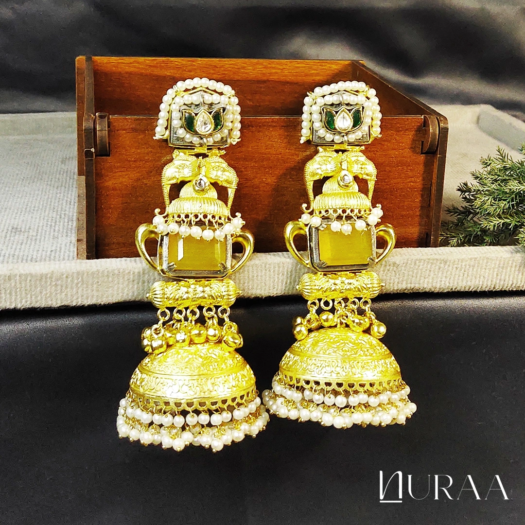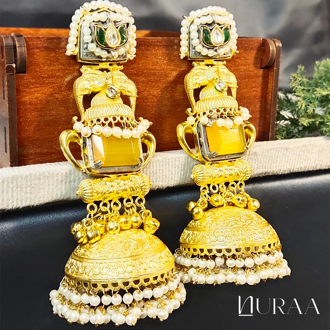 Design: Multi-layer structure with Lotus motif top, twin elephant heads, a kalash/vessel motif with the big yellow stone and a heavy dome jhumka with pearl latkans