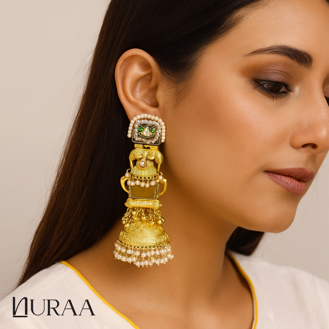 A statement pair inspired by the grandeur of traditional Kashmiri & temple artistry. These earrings feature lotus meenakari, elephant motifs, miniature kalash details, and a big dome jhumka finished with delicate pearl hangings—an heirloom piece crafted to stand out in every festive look.