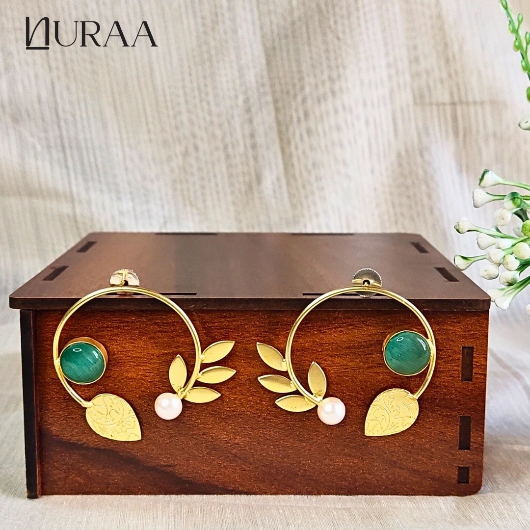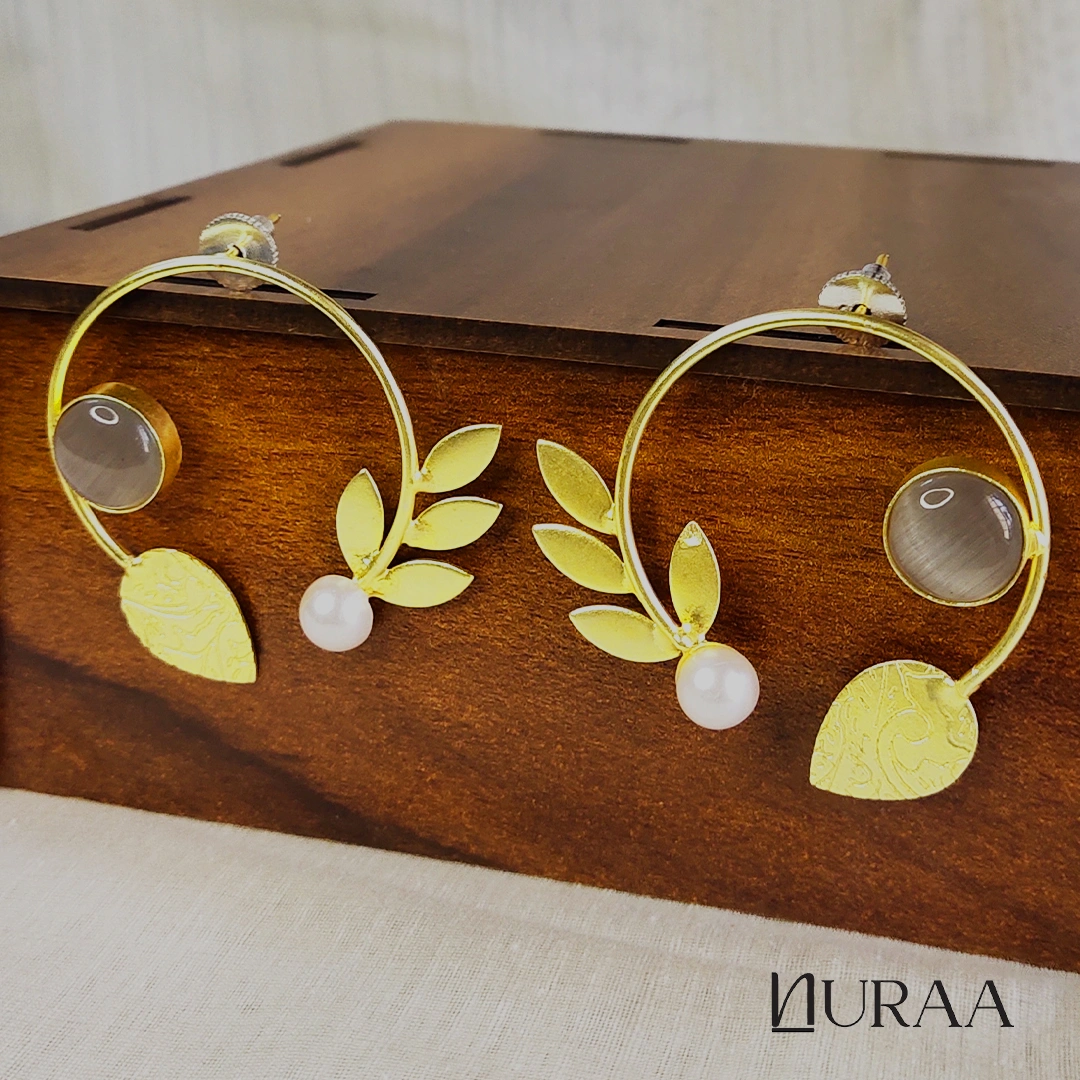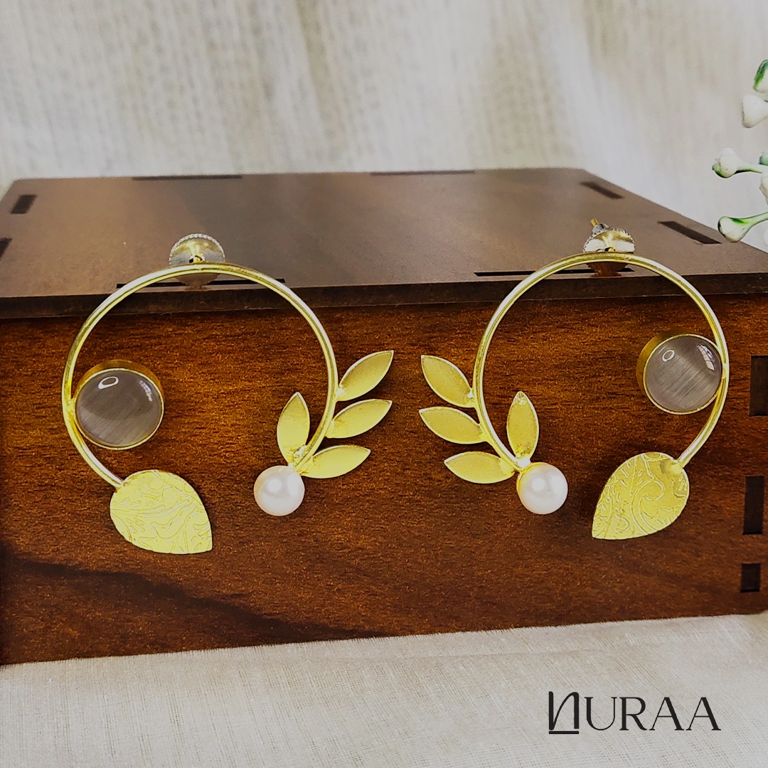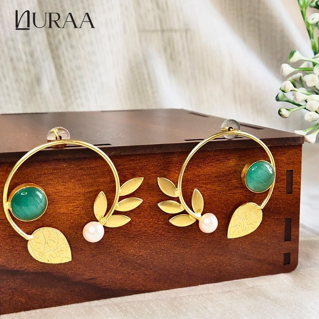 Modern elegance meets artistic detailing in these Leaf Aura Hoop Earrings. Designed with a graceful circular frame, embossed leaf motifs, a luminous pearl, and a glossy cat-eye stone, these earrings bring a fresh, nature-inspired charm to your everyday and festive looks. Lightweight, chic, and versatile — perfect for those who love subtle statement jewellery.