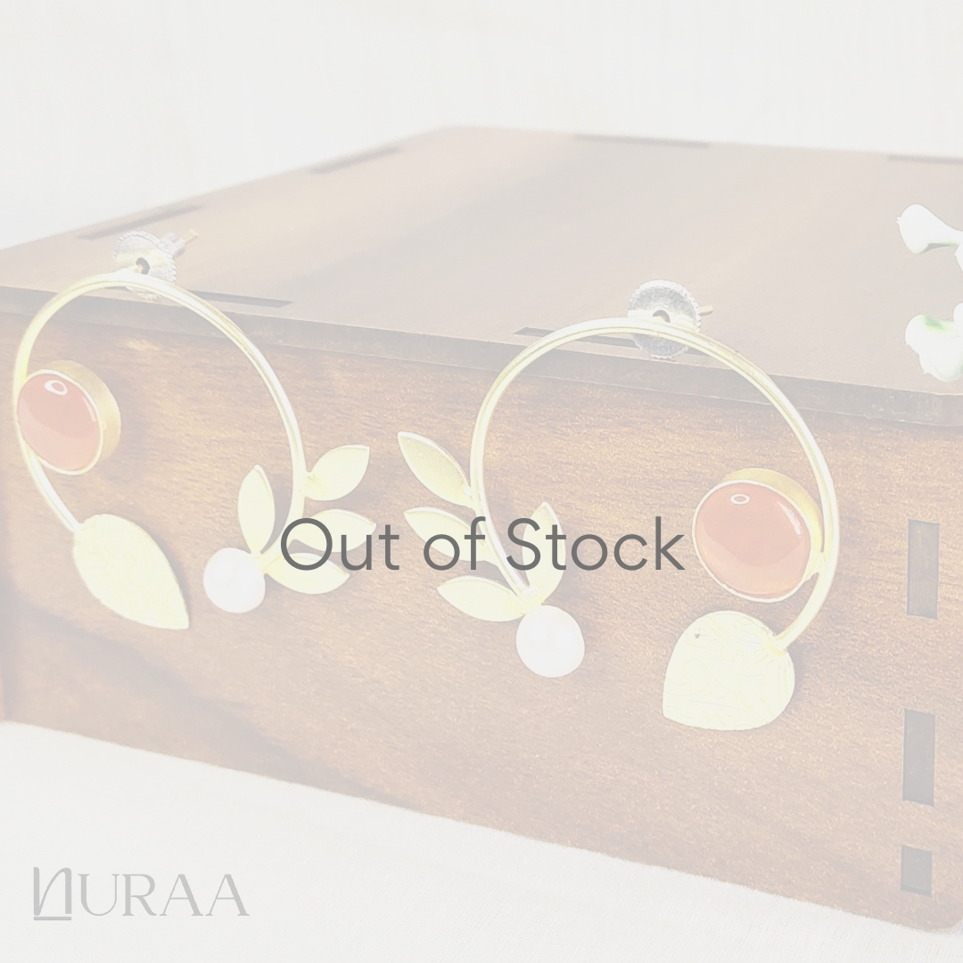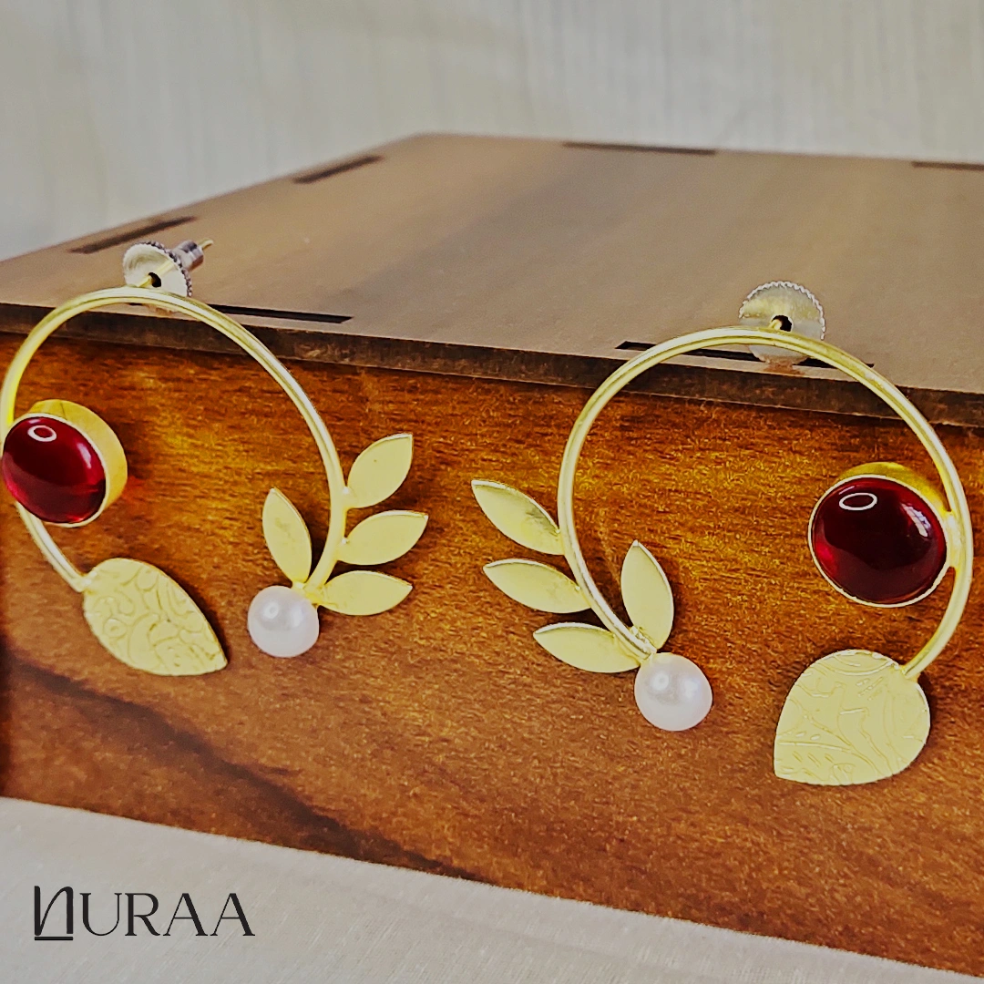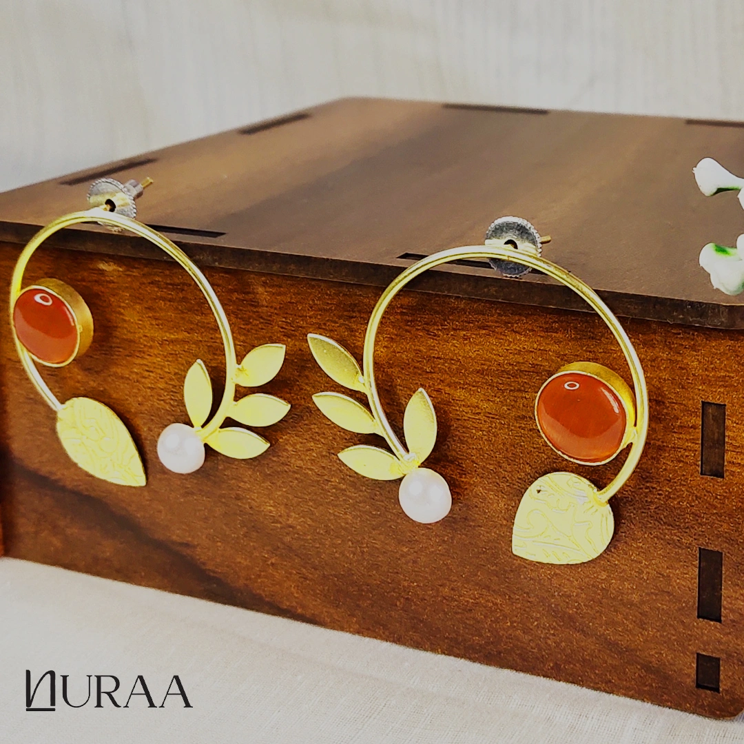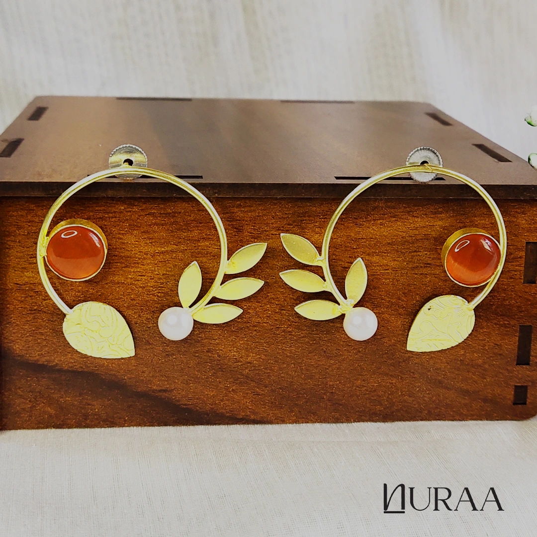 Modern elegance meets artistic detailing in these Leaf Aura Hoop Earrings. Designed with a graceful circular frame, embossed leaf motifs, a luminous pearl, and a glossy cat-eye stone, these earrings bring a fresh, nature-inspired charm to your everyday and festive looks. Lightweight, chic, and versatile — perfect for those who love subtle statement jewellery.