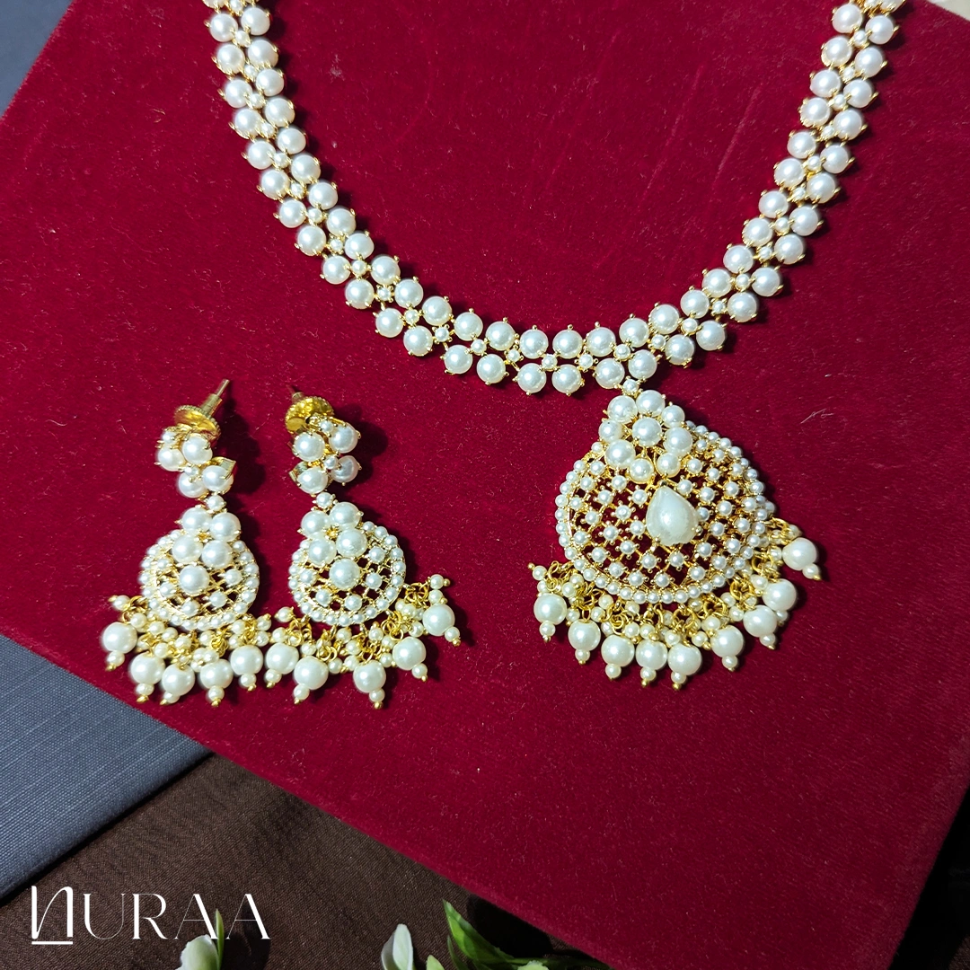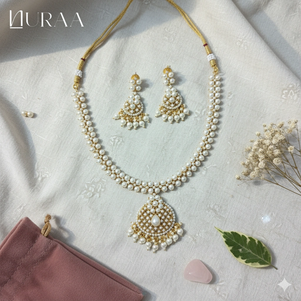 Embrace royal charm with the Meher Pearl Necklace Set by NURAA. Designed in a traditional Hyderabadi-inspired style, this exquisite set features a layered pearl necklace with an ornate pendant accented by lustrous pearls and gold detailing. The matching earrings mirror the same intricate craftsmanship, making this set perfect for weddings, festive celebrations, or elegant traditional gatherings. A timeless piece that beautifully blends sophistication with classic allure.