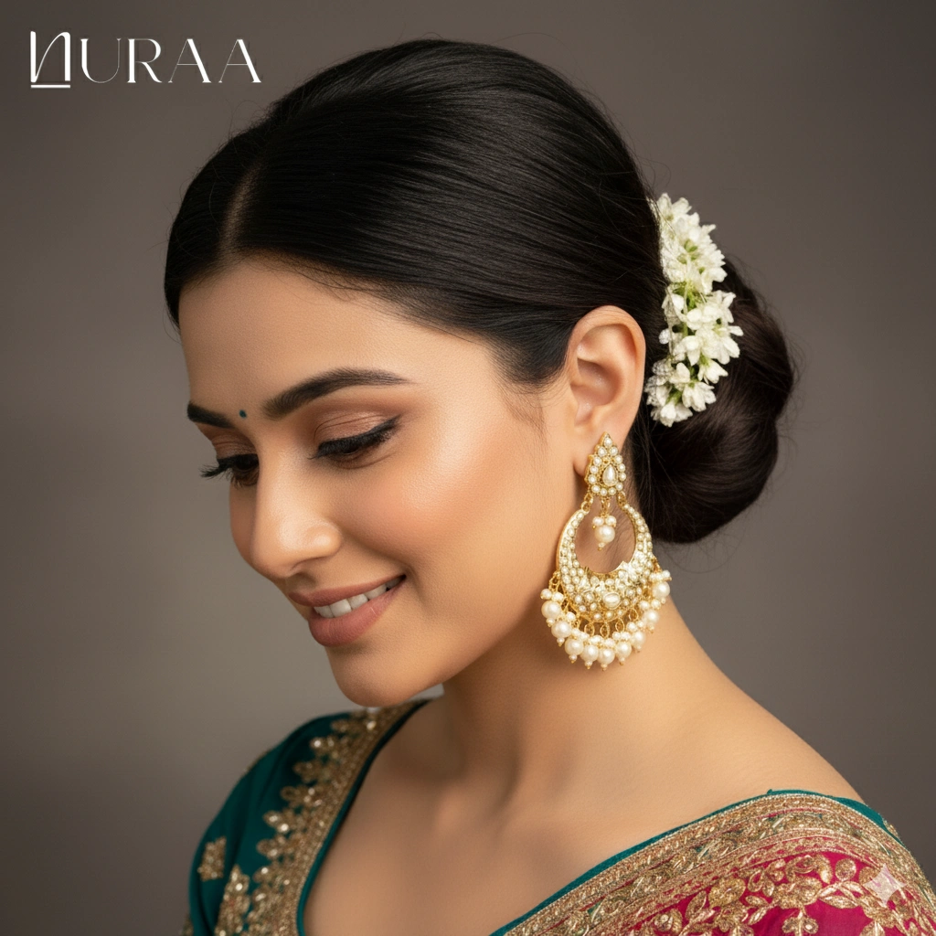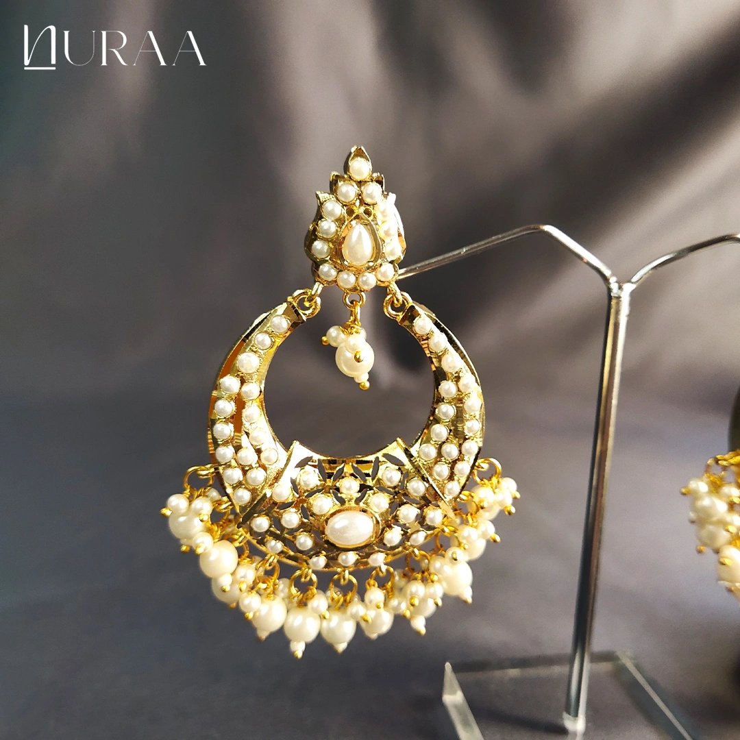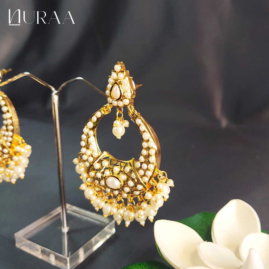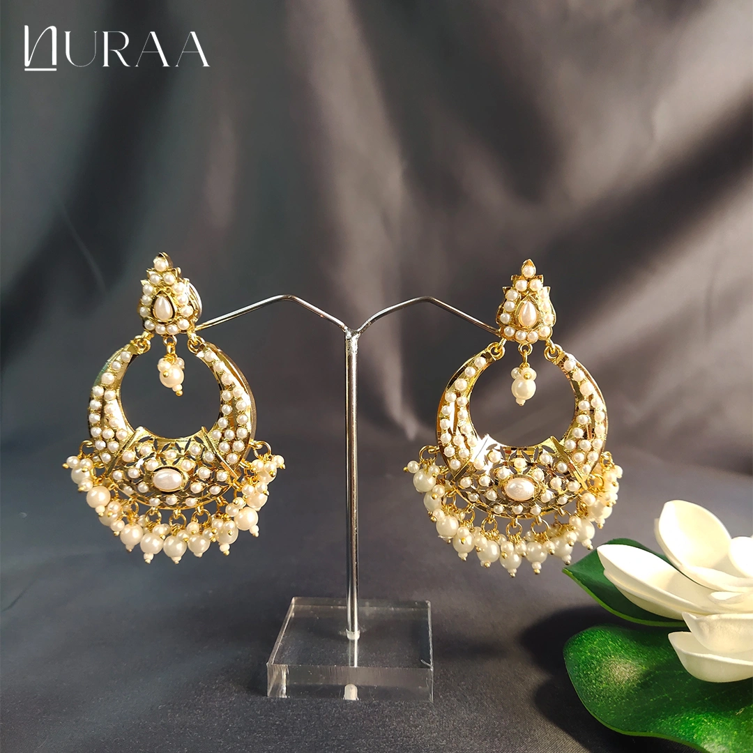The crescent silhouette, inspired by Mughal artistry, is delicately accented with pearl droplets that sway gracefully, creating a statement of pure grandeur. Whether paired with a saree, lehenga, or anarkali, these chandbalis elevate your festive and bridal ensembles with effortless regality.