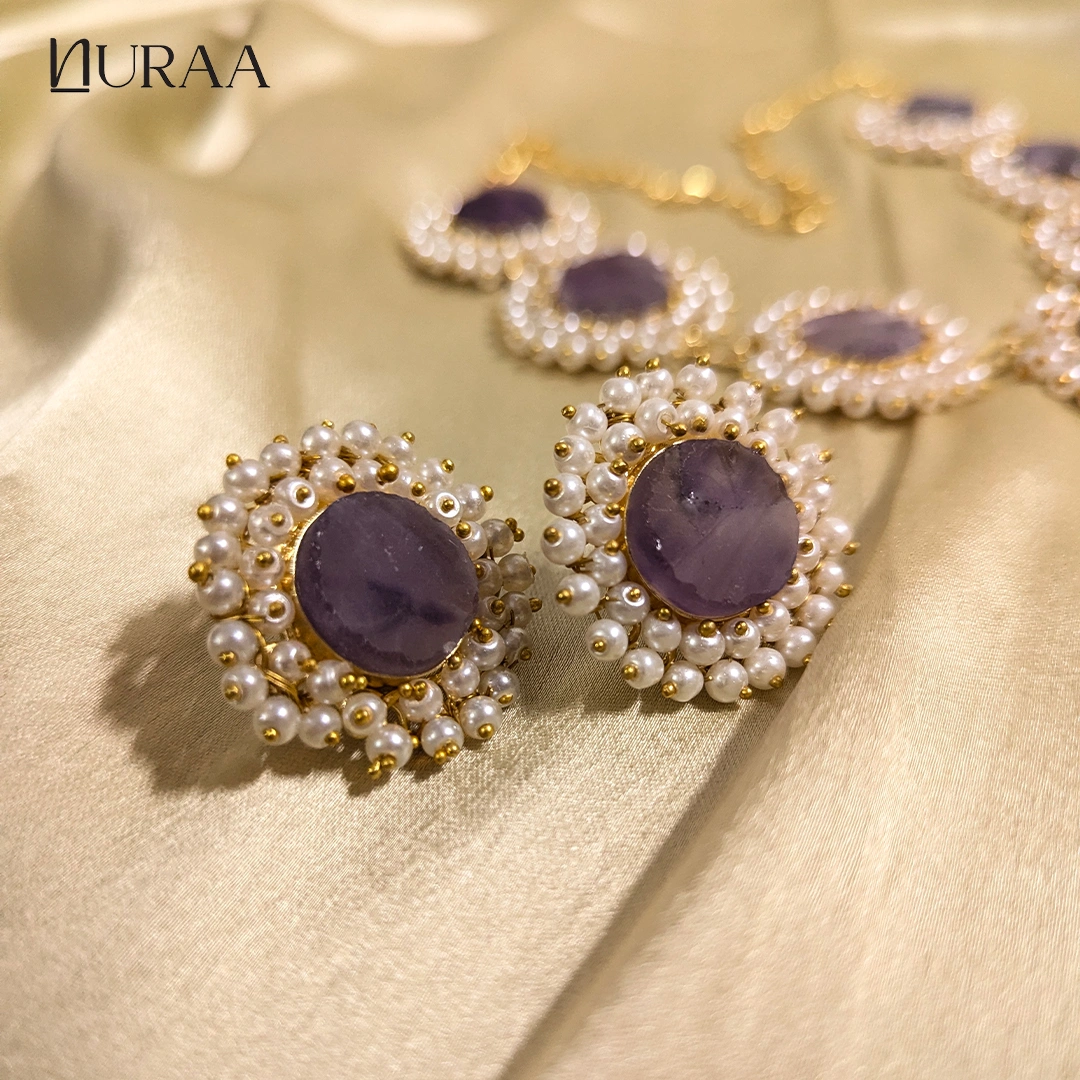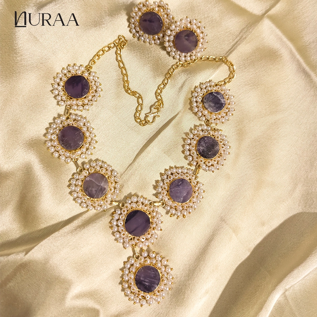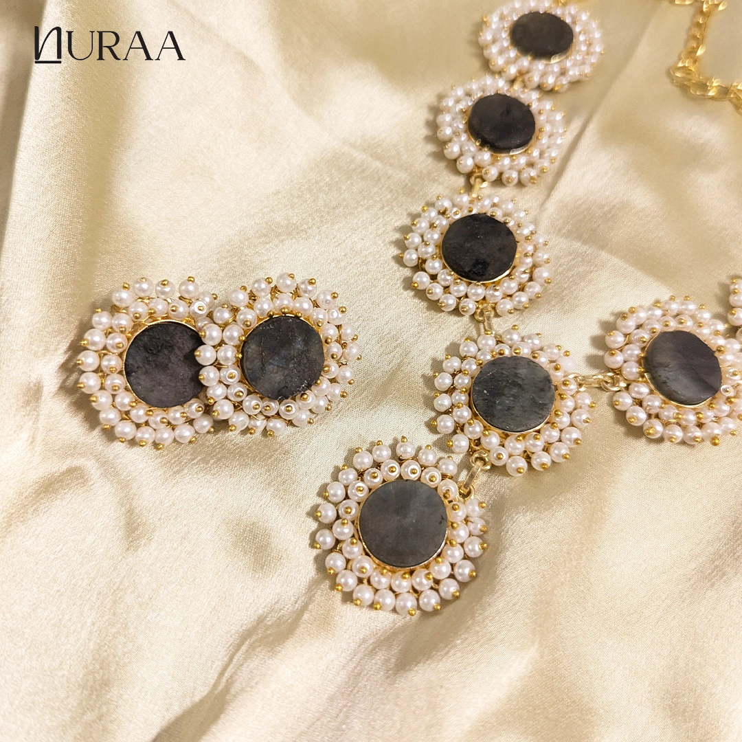 NURAA’s Pearl Medallion Necklace Set, features circular natural stone medallions, delicately framed with hand-set pearl halos and finished in a soft gold tone. The design flows beautifully along the neckline, with a statement drop at the center that adds just the right touch of elegance. Lightweight yet eye-catching, this piece blends classic pearls with contemporary charm—perfect for festive wear, weddings, and elegant evenings.