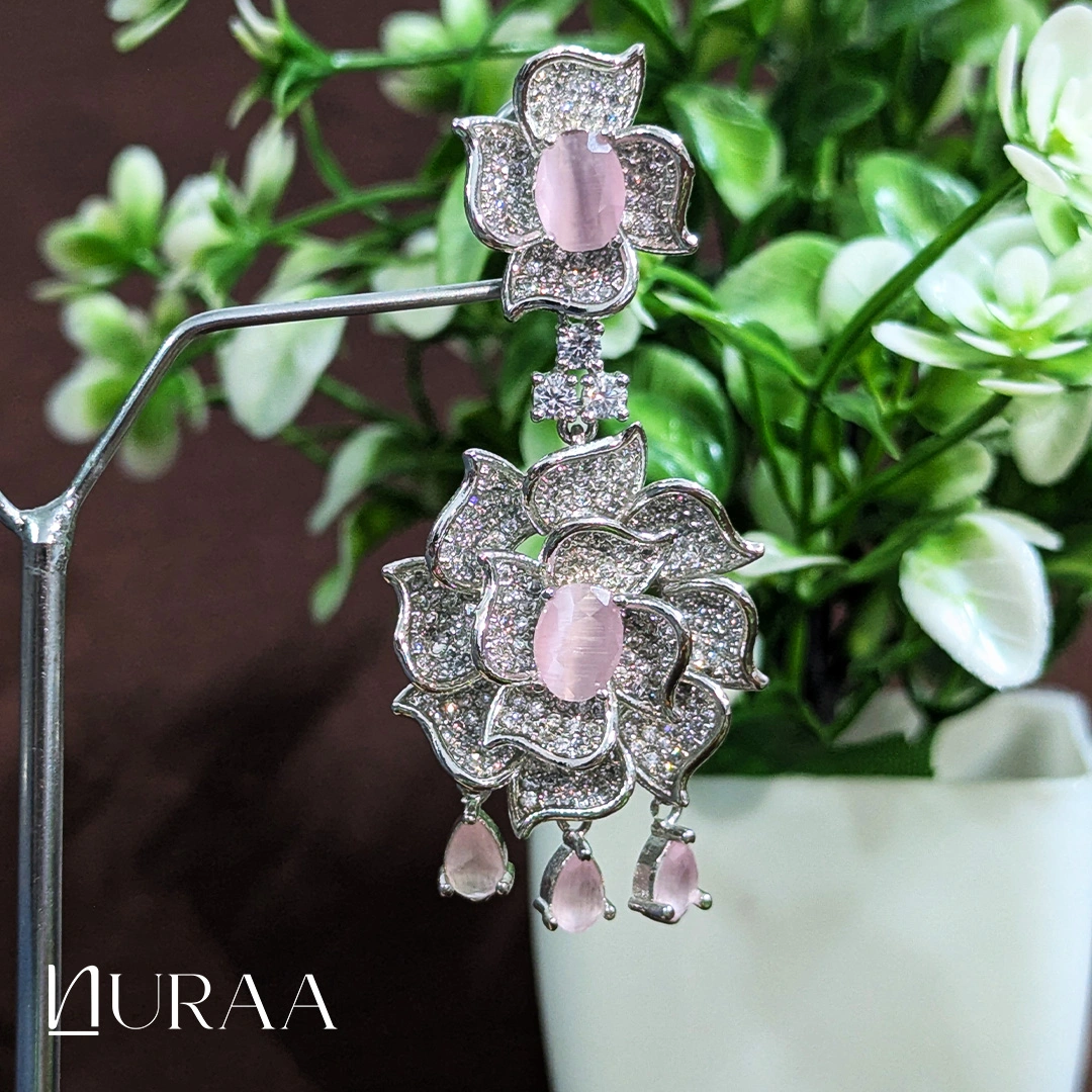 Ethereal and elegant, the Pink Aura Earrings by NURAA capture the essence of soft luxury. Designed in a delicate floral motif, these earrings feature shimmering zircon petals encasing smooth baby pink stones, creating a look that is both radiant and romantic. The subtle pastel tone makes them ideal for festive celebrations, weddings, or evening soirées — a perfect blend of grace and glamour.