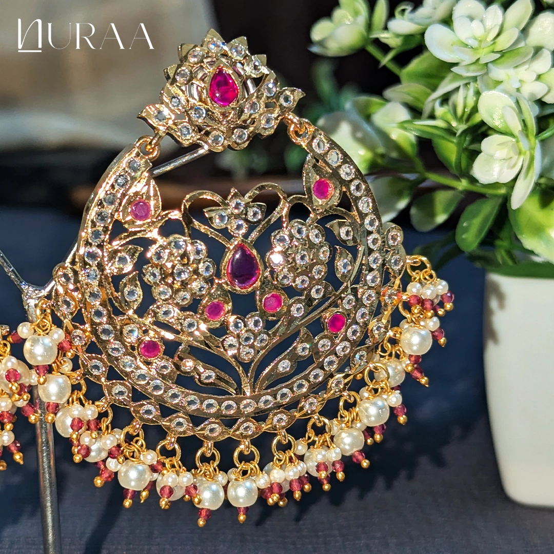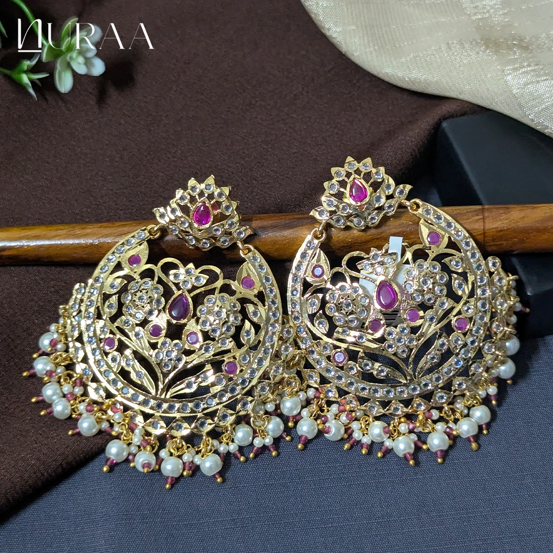 Step into royal elegance with Regal Ruby Jadau Chand Bali Earrings by NURAA. Crafted in authentic Jadau work and finished with real gold plating, these oversized chandbalis showcase the timeless beauty of Hyderabadi style. Adorned with ruby stones, intricate floral motifs, shimmering polkis, and finished with a cascade of tiny lustrous pearls, they exude grandeur and tradition. Perfect for festive occasions, weddings, and cultural celebrations, these earrings are a true statement of heritage luxury.