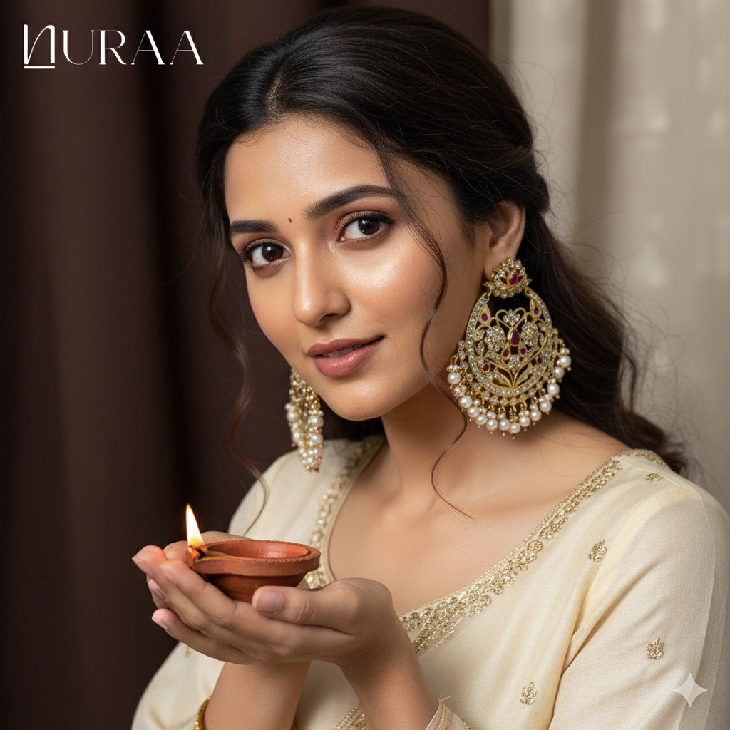 Step into royal elegance with Regal Ruby Jaadu Chand Bali Earrings by NURAA. Crafted in authentic Jaadu work and finished with real gold plating, these oversized chandbalis showcase the timeless beauty of Hyderabadi style. Adorned with ruby stones, intricate floral motifs, shimmering polkis, and finished with a cascade of tiny lustrous pearls, they exude grandeur and tradition. Perfect for festive occasions, weddings, and cultural celebrations, these earrings are a true statement of heritage luxury.