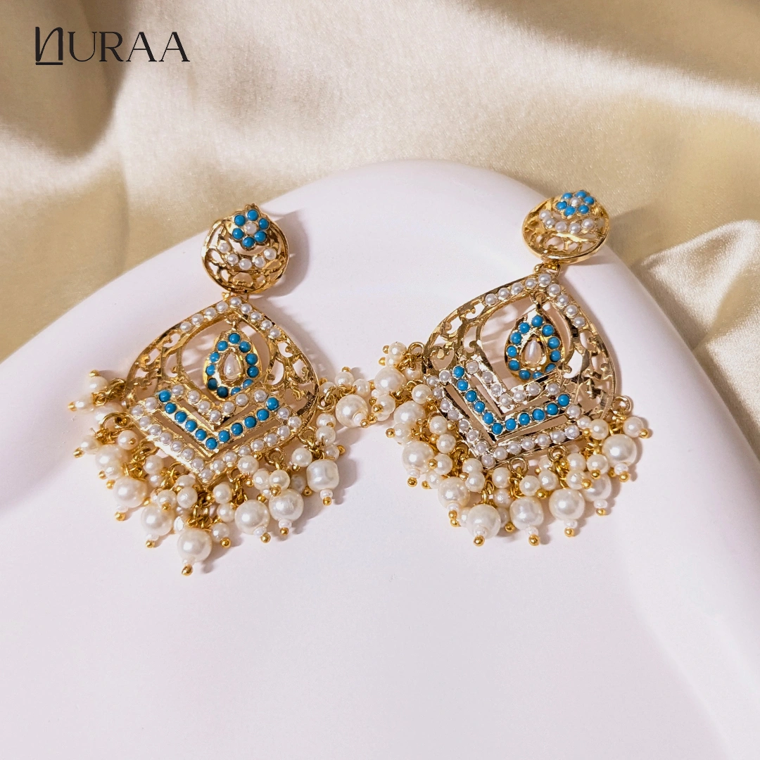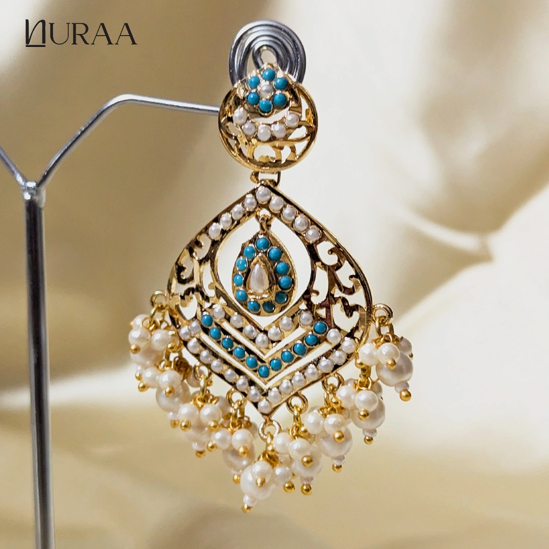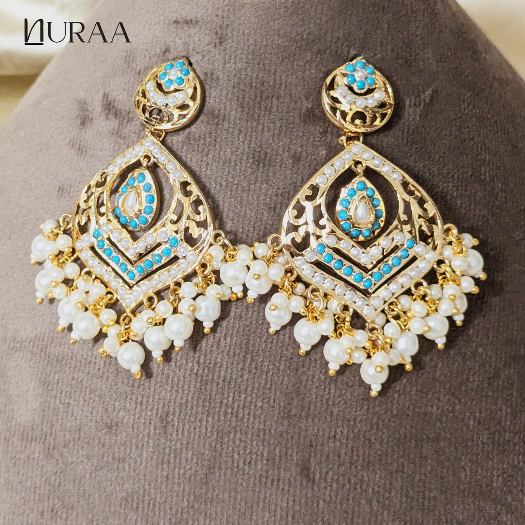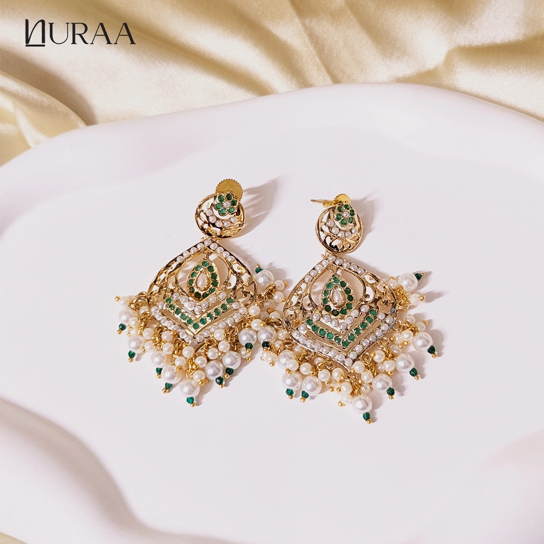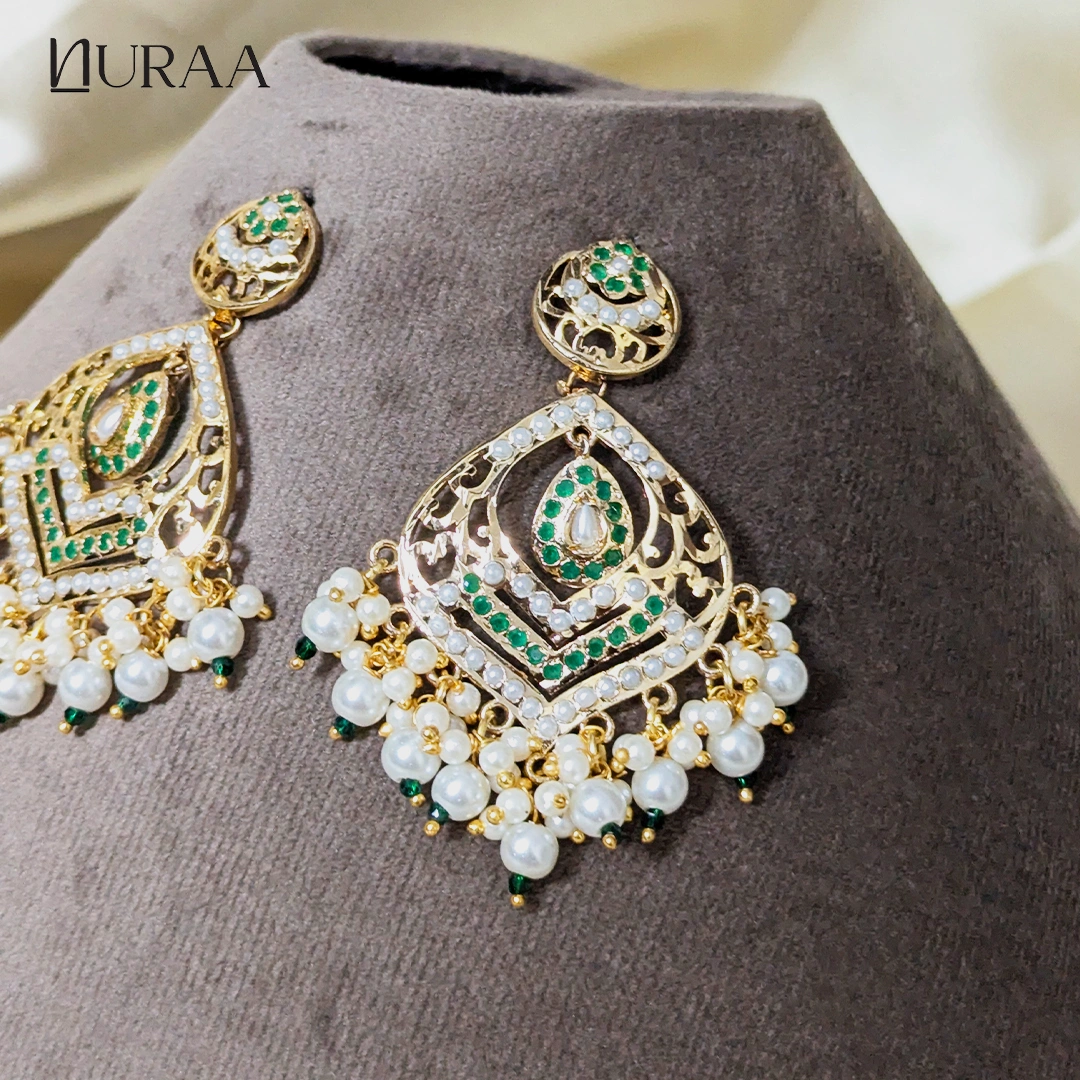 Inspired by timeless Indian heritage, Sahiba Jadau Chandbali Earrings by NURAA, showcase intricate craftsmanship adorned with delicate pearls and richly hued stones. The layered circular design adds graceful movement, while the pearl drops lend a soft, regal charm. Perfect for weddings, festive occasions and ethnic celebrations. These Chandbalis effortlessly elevate sarees, lehengas and anarkalis with their classic yet statement appeal.
