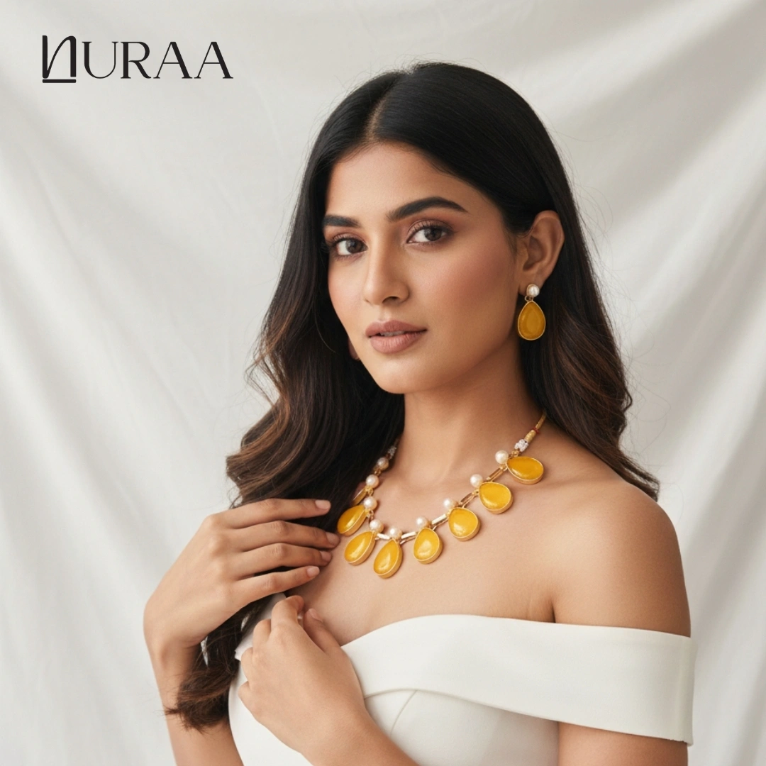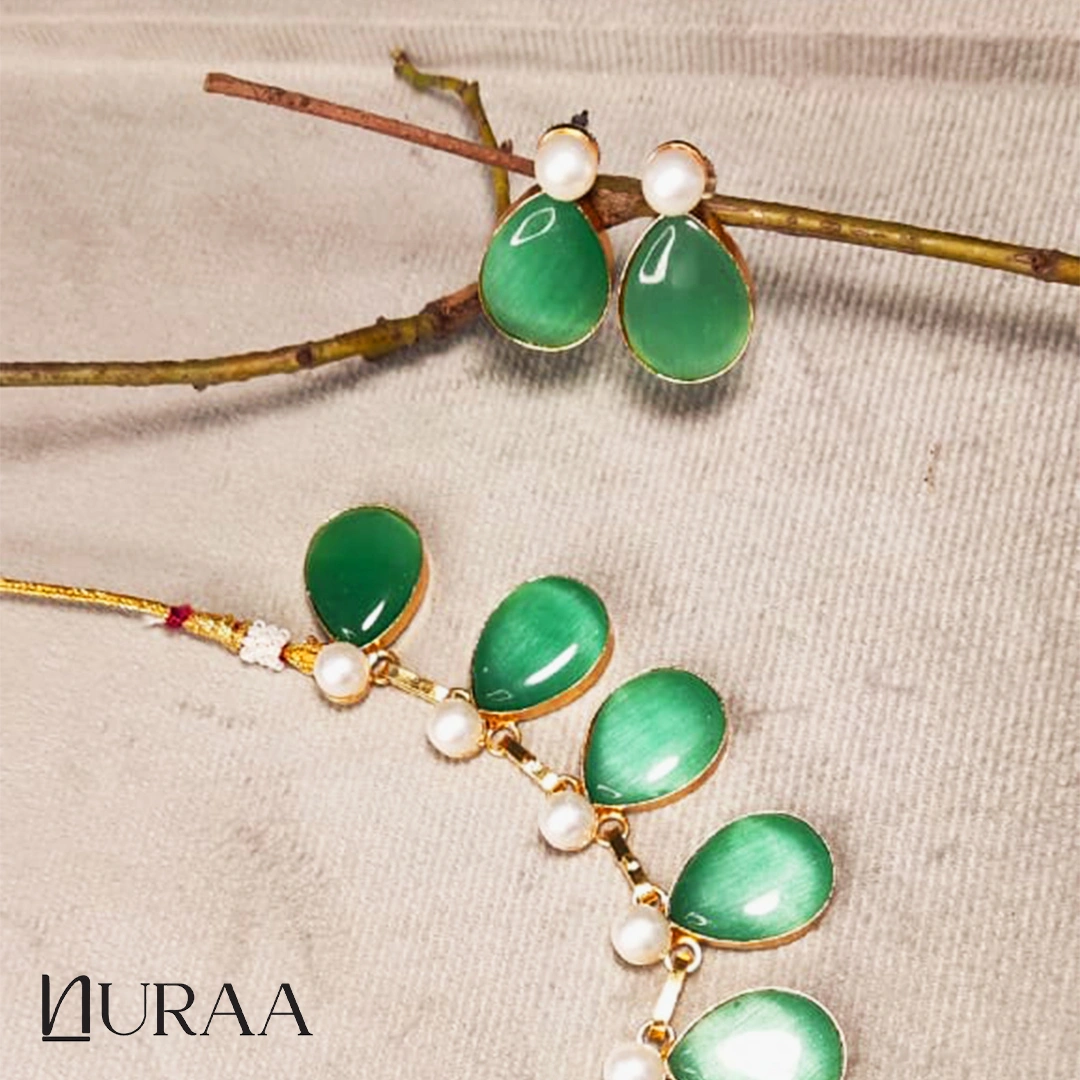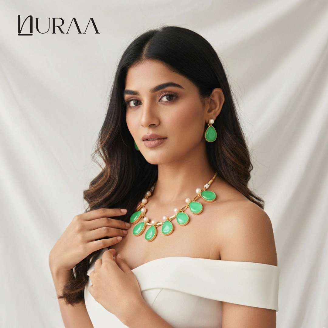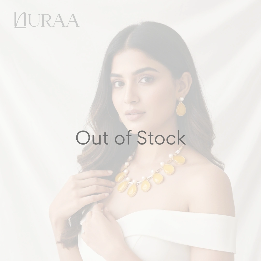 This SereneDrops Necklace Set by NURAA, features glossy teardrop-cut stones arranged in a cascading pattern, enriched with luminous pearls and sleek gold-toned connectors. The matching earrings mirror the same teardrop design for a cohesive and elegant finish. The design is lightweight, classy and crafted to elevate kurtas, sarees, suits, Indo-western or western outfits effortlessly.