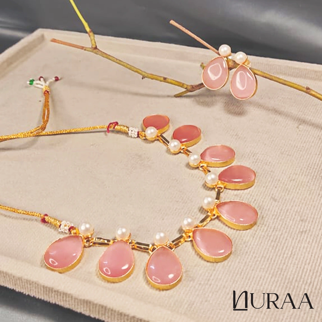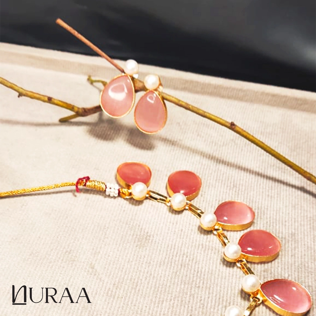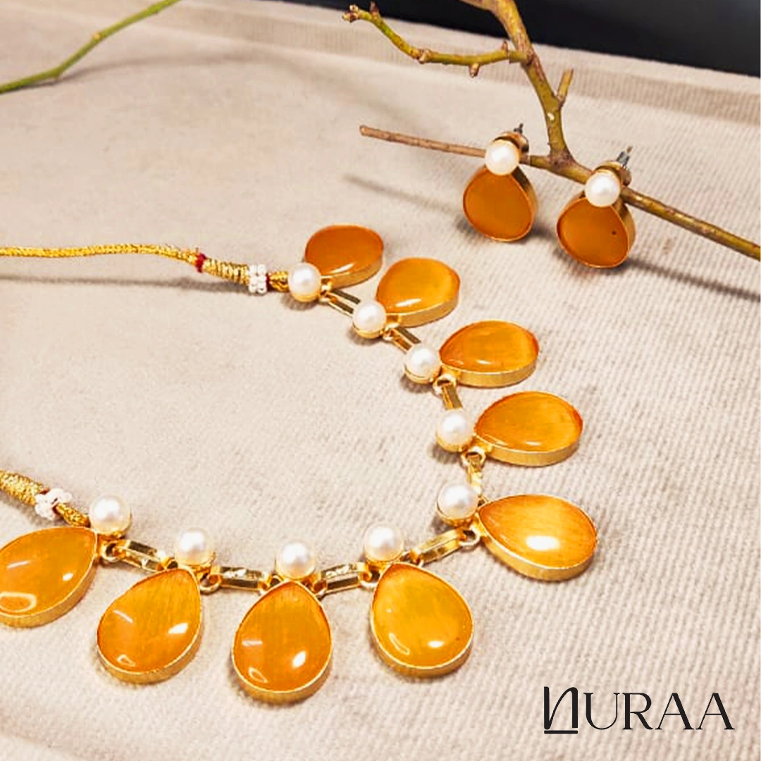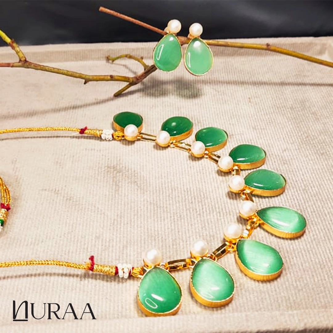 This SereneDrops Necklace Set by NURAA, features glossy teardrop-cut stones arranged in a cascading pattern, enriched with luminous pearls and sleek gold-toned connectors. The matching earrings mirror the same teardrop design for a cohesive and elegant finish. The design is lightweight, classy and crafted to elevate kurtas, sarees, suits, Indo-western or western outfits effortlessly.