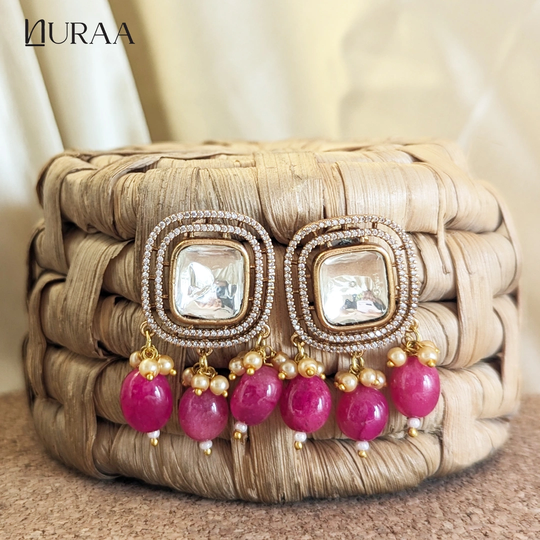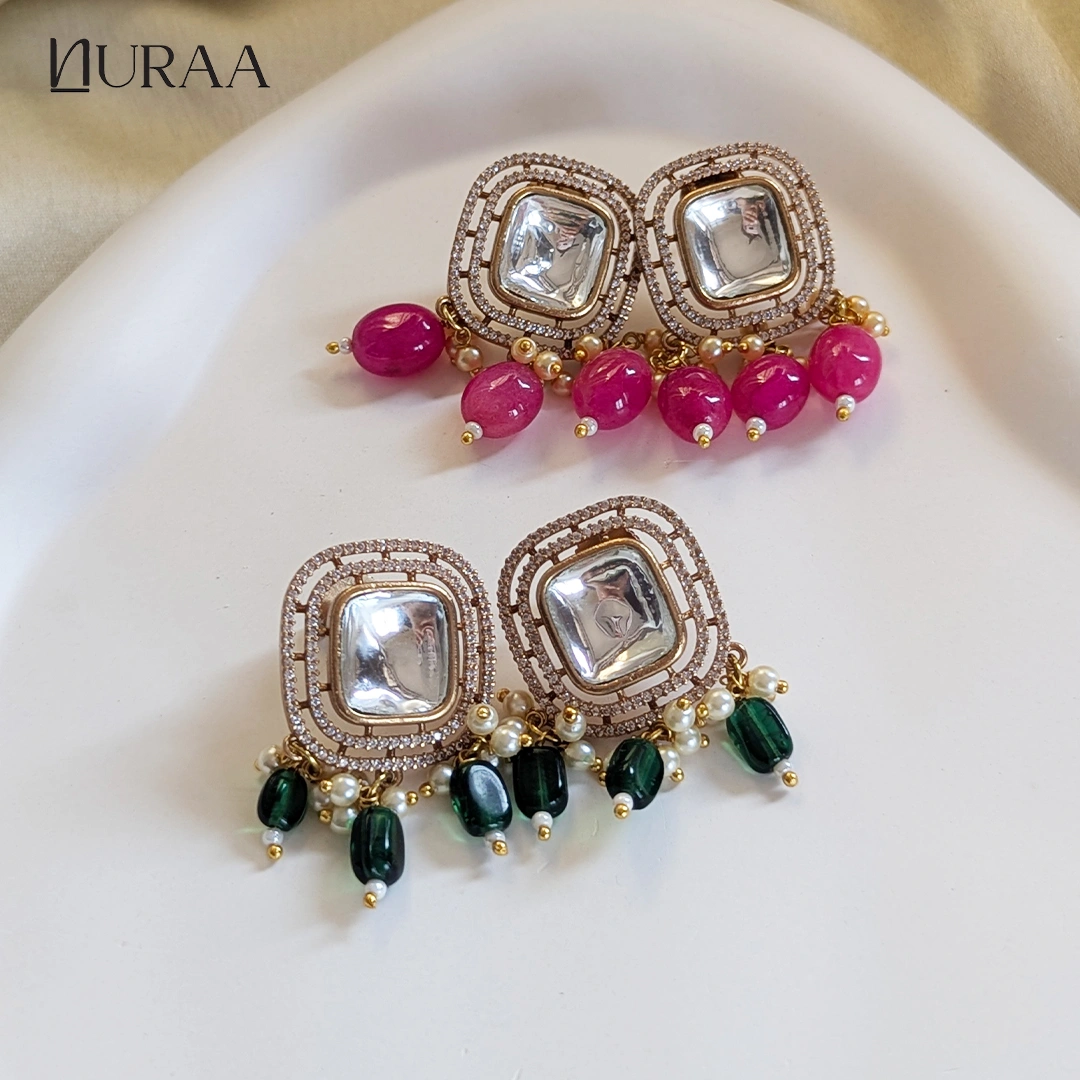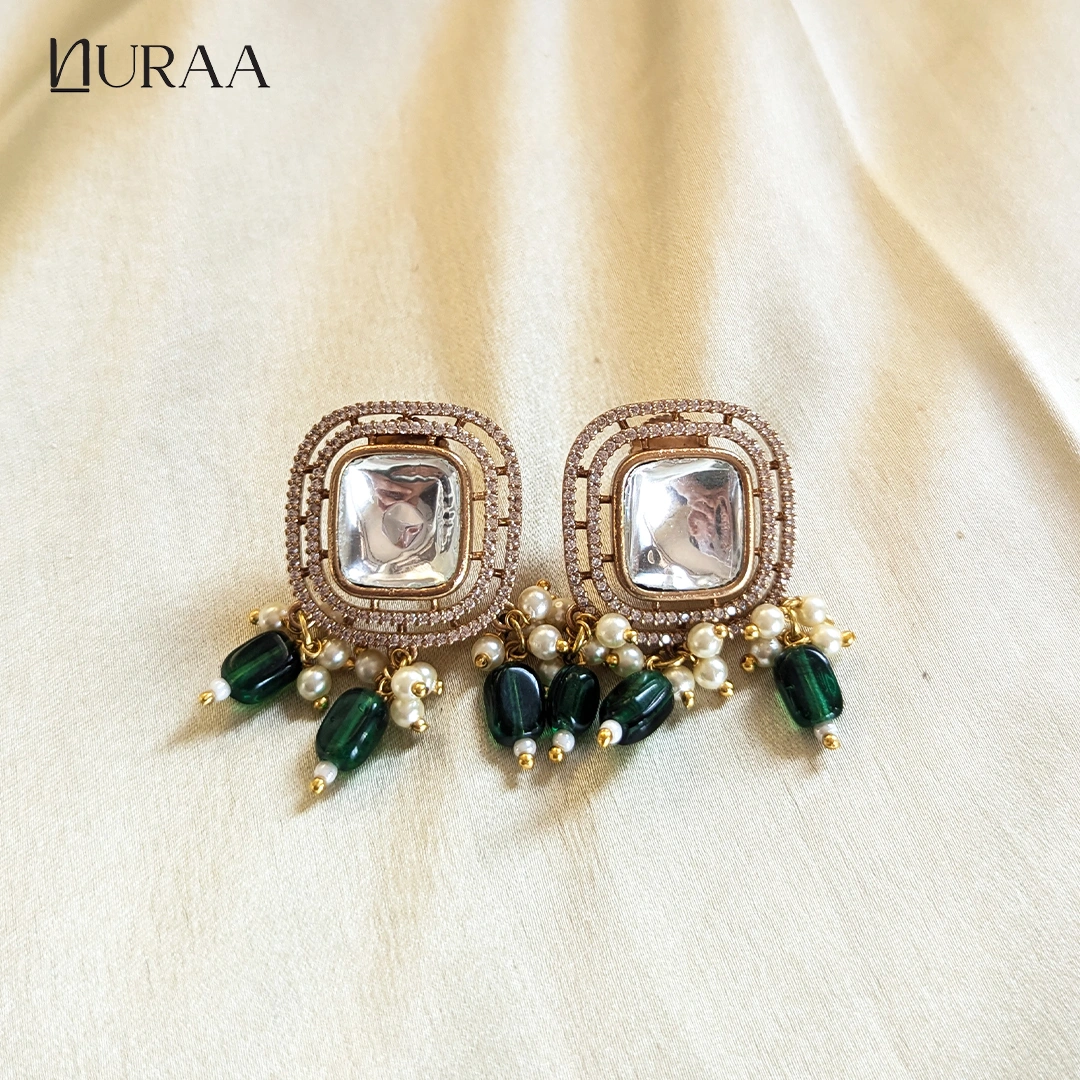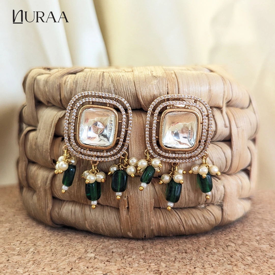 Square Moissanite Polki Earrings by NURAA, feature a radiant mirror-polki centre framed with delicate zircon detailing, finished with graceful bead drops. They are designed in a soft antique gold tone and strike the perfect balance between classic charm and contemporary elegance.They are ideal for festive wear, weddings, or intimate celebrations.