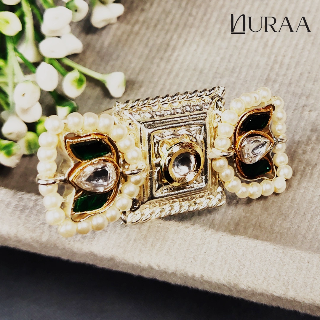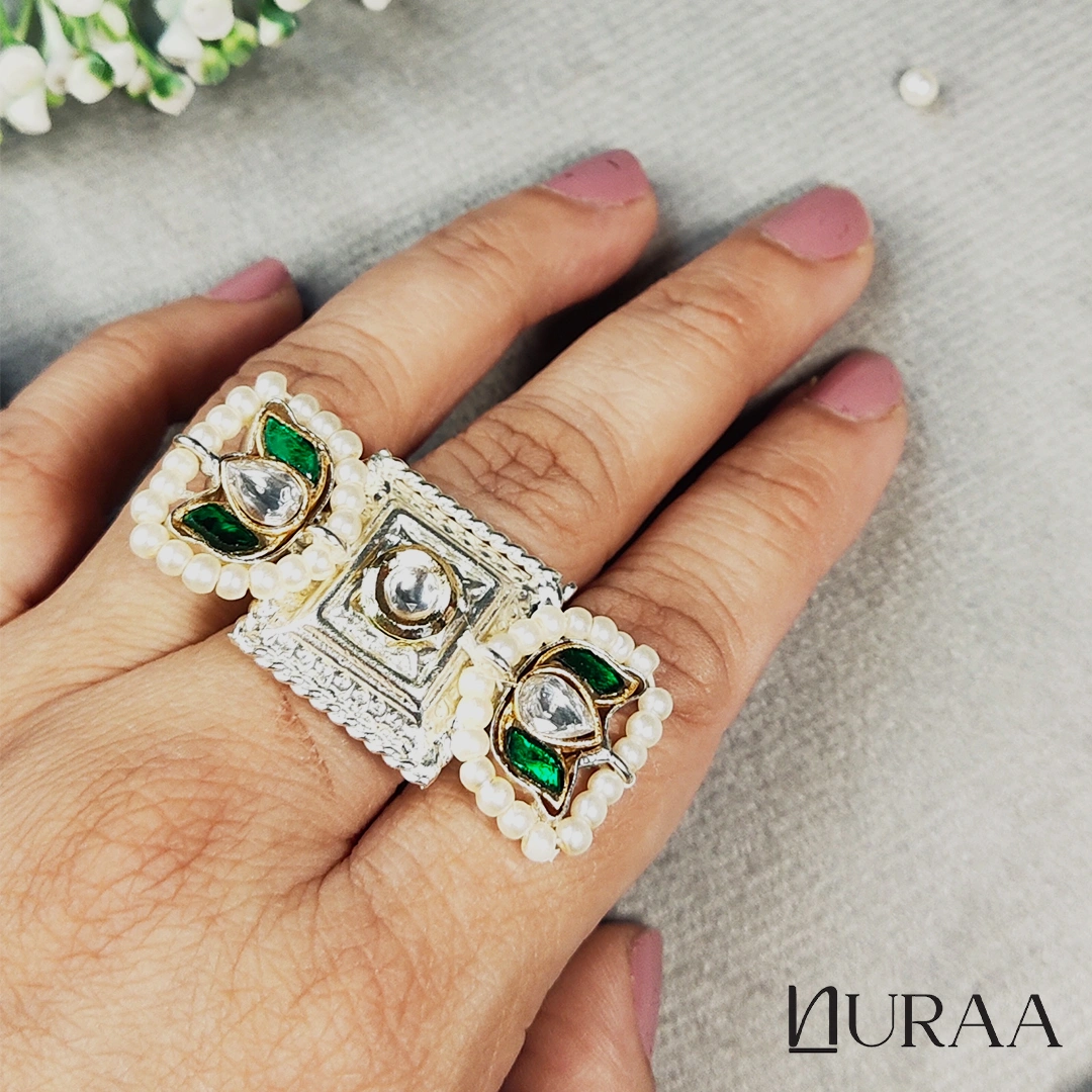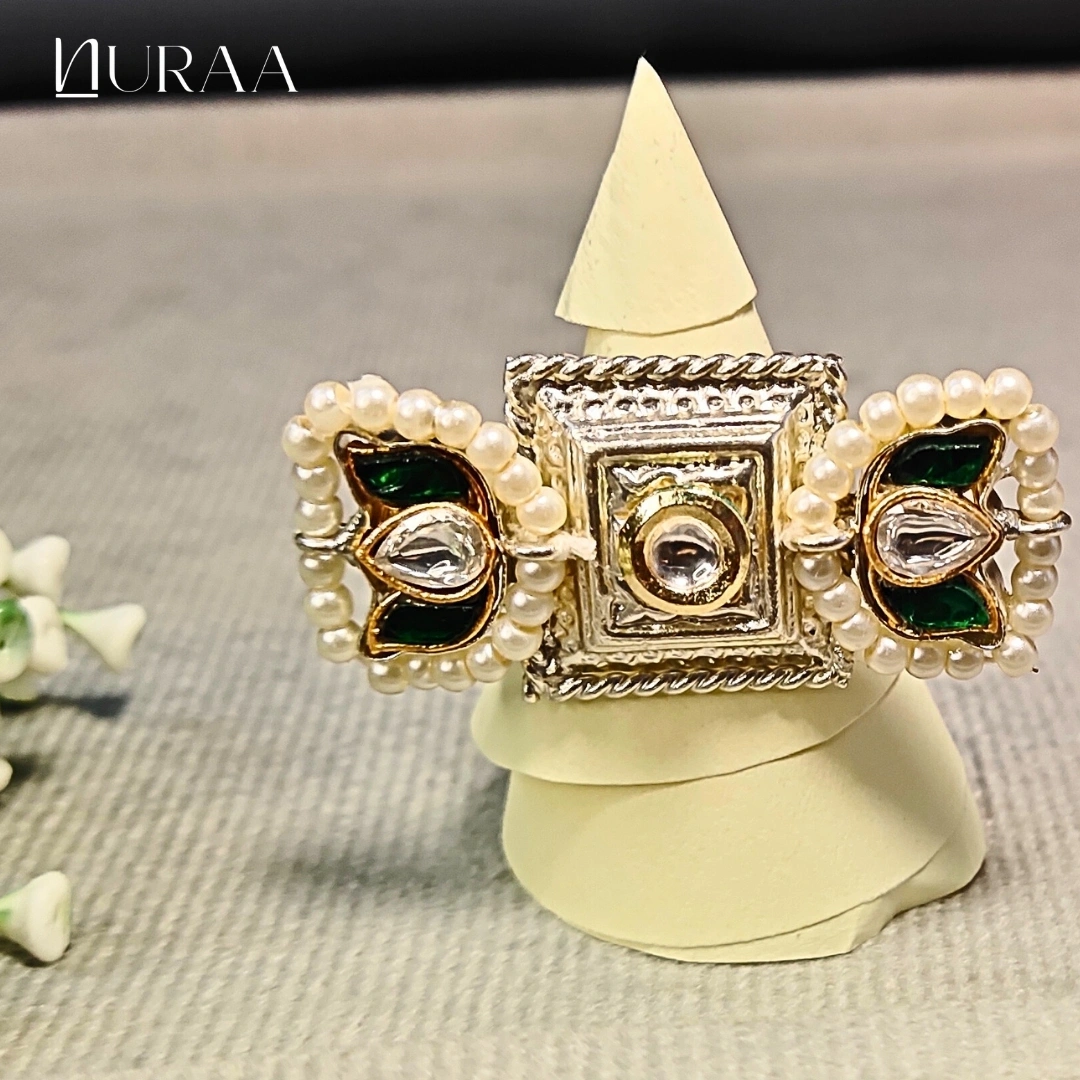 A striking handcrafted dual tone ring that blends heritage charm with bold contemporary design. Featuring a unique three-panel layout, this ring is adorned with jadau-style polki stones, embossed work and a delicate cluster of mini pearls outlining the edges. Perfect for festive occasions, ethnic wear, weddings and days when you want your jewellery to speak for you.