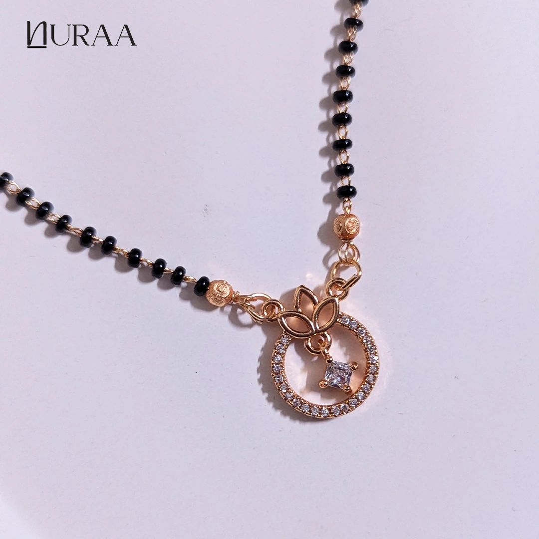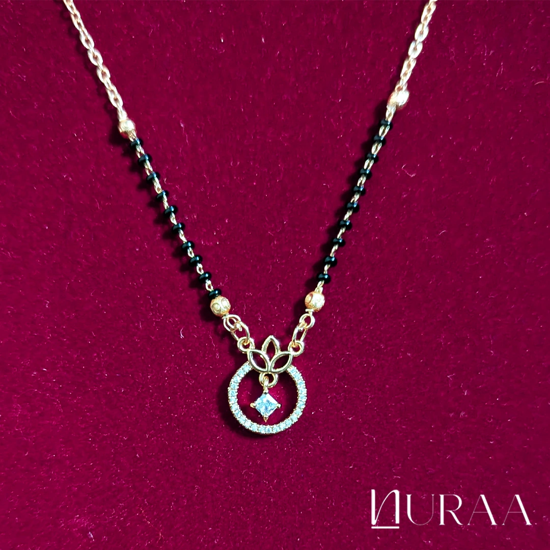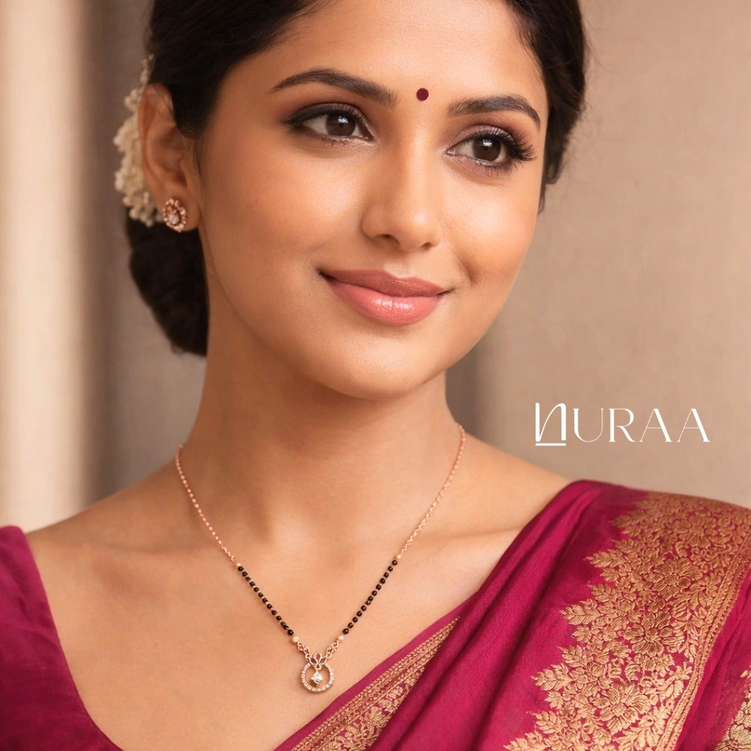 Designed for the modern woman, this sleek mangalsutra features a delicate circular pendant accented with a subtle sparkle at the center. The dull rosegold finish lends a refined, contemporary charm, making it perfect for everyday wear while still honoring tradition. Lightweight and elegant, it pairs effortlessly with both ethnic and western outfits—ideal for those who prefer understated sophistication with timeless meaning.