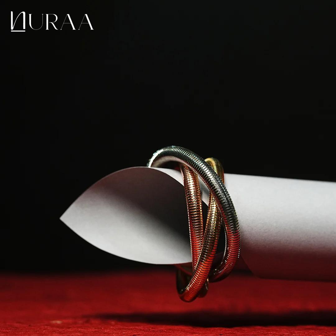 Elevate your style with the TrioTwist Flexible bracelet by NURAA. Designed with three twisted strands, this versatile bracelet combines contemporary charm with timeless sophistication. Available in Gold, Silver and a stunning Gold–Silver–Rosegold mix, its flexible design ensures a comfortable fit while adding an effortless statement to any outfit. Perfect for everyday wear, parties, or layered with other jewellery, this wrist wear is a must-have modern essential.