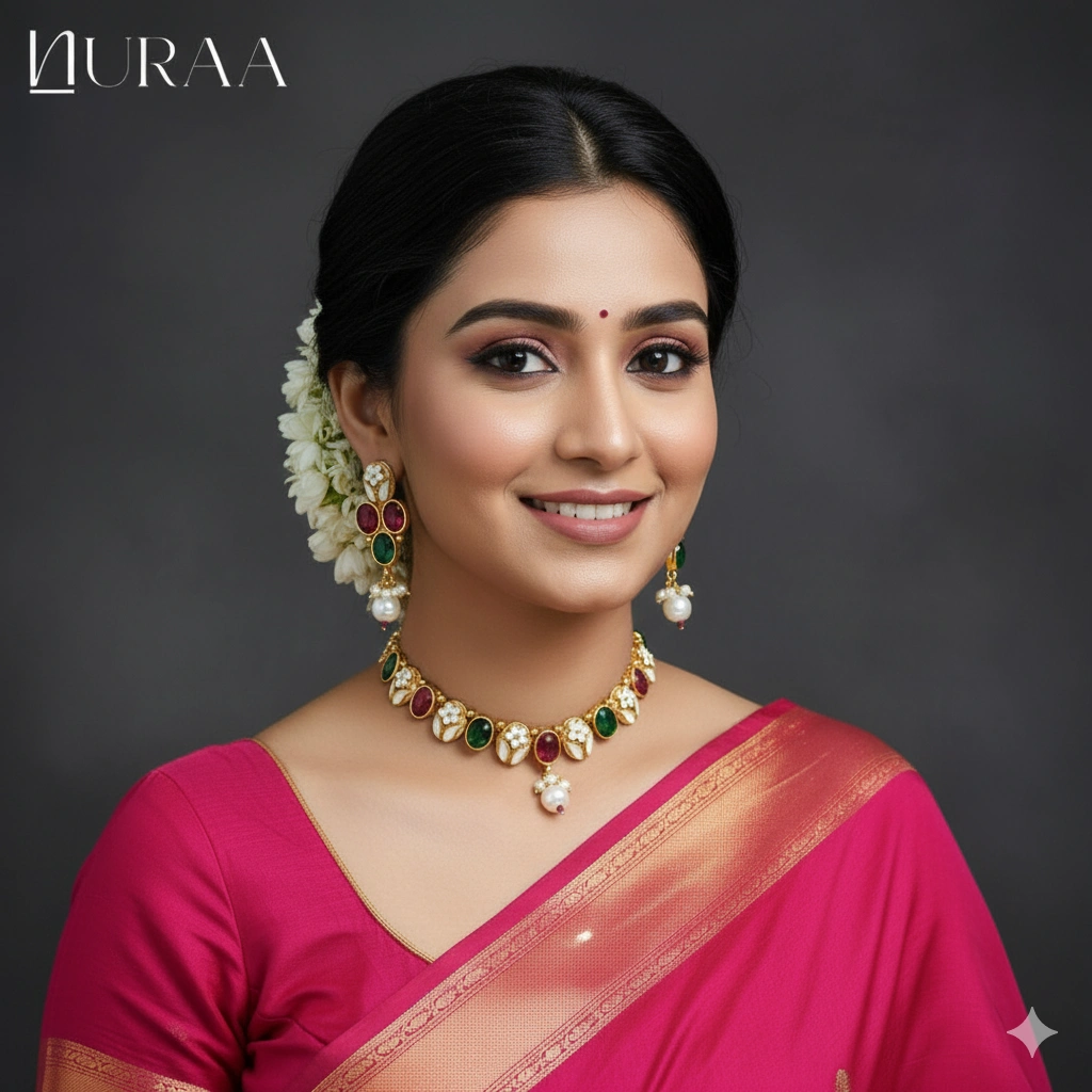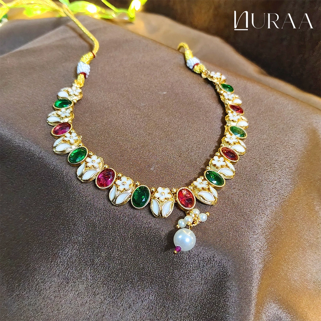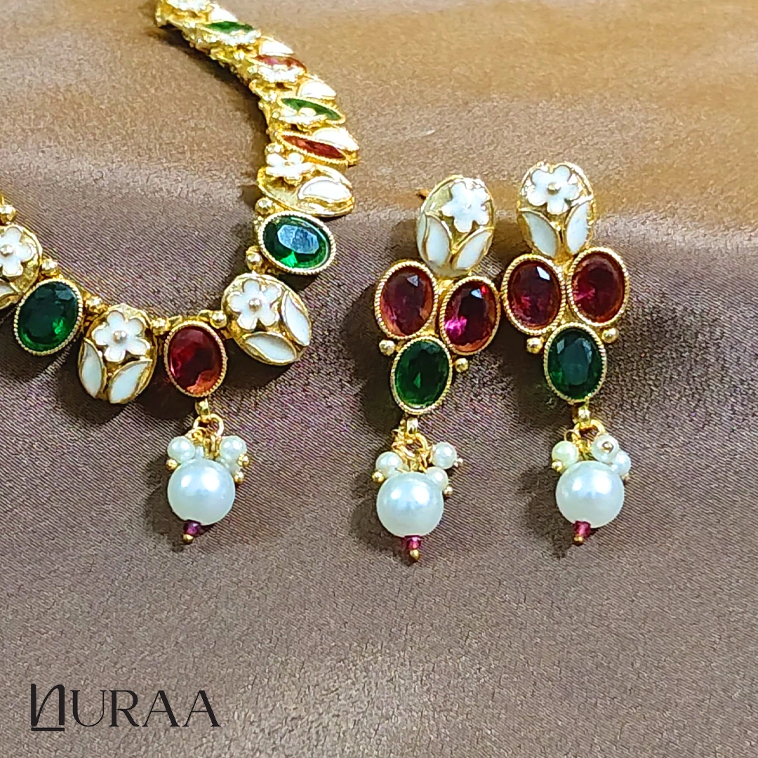 Drape yourself in elegance with NURAA’s White Enamel Flora Necklace Set , a mesmerizing creation that celebrates timeless artistry. Crafted with precision, this stunning set features a medley of ruby and emerald-hued stones, surrounded by delicate hand-painted enamel floral motifs and finished with lustrous pearls for a touch of regal charm.