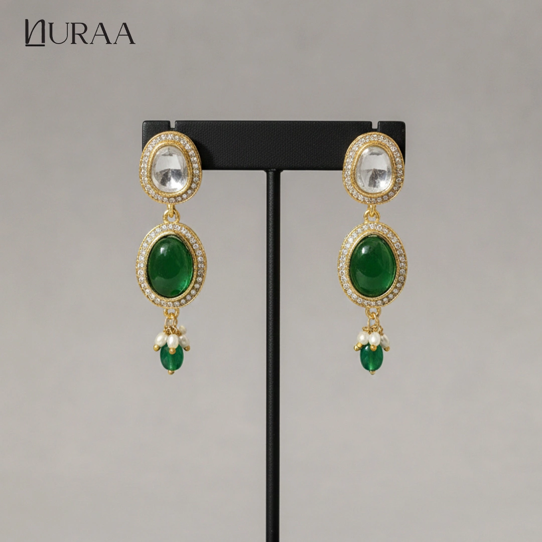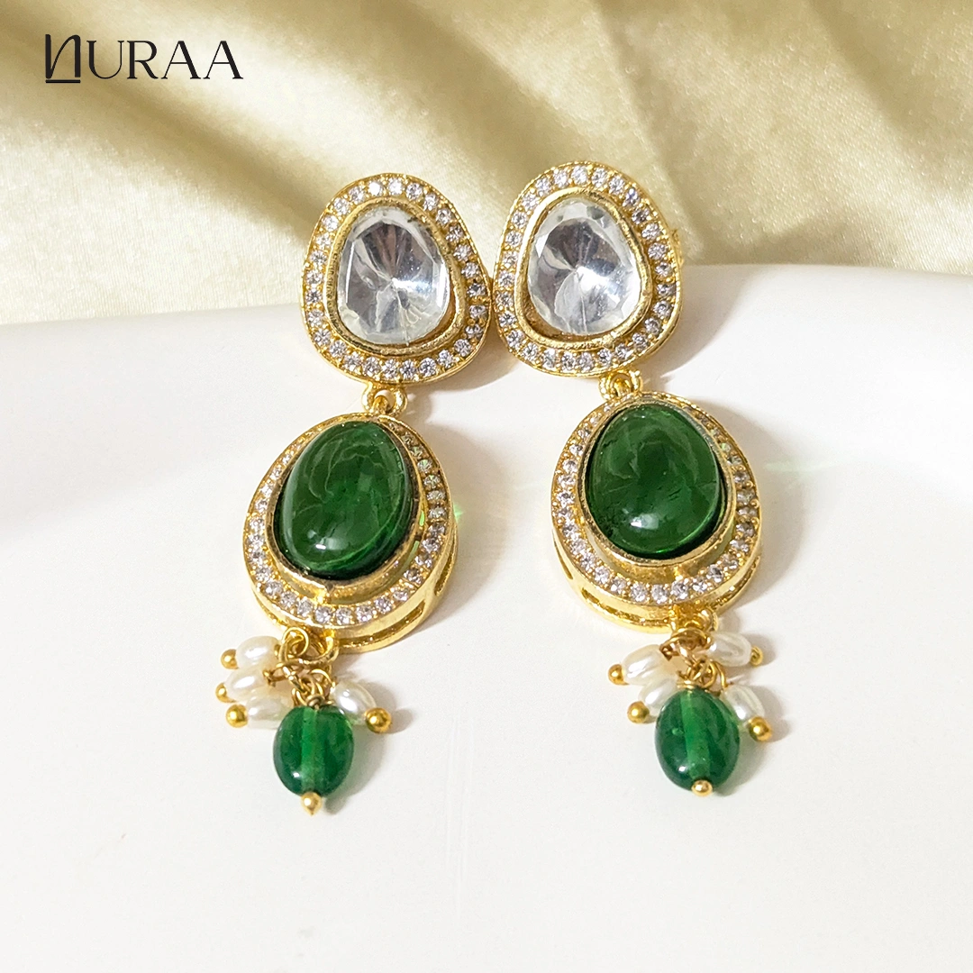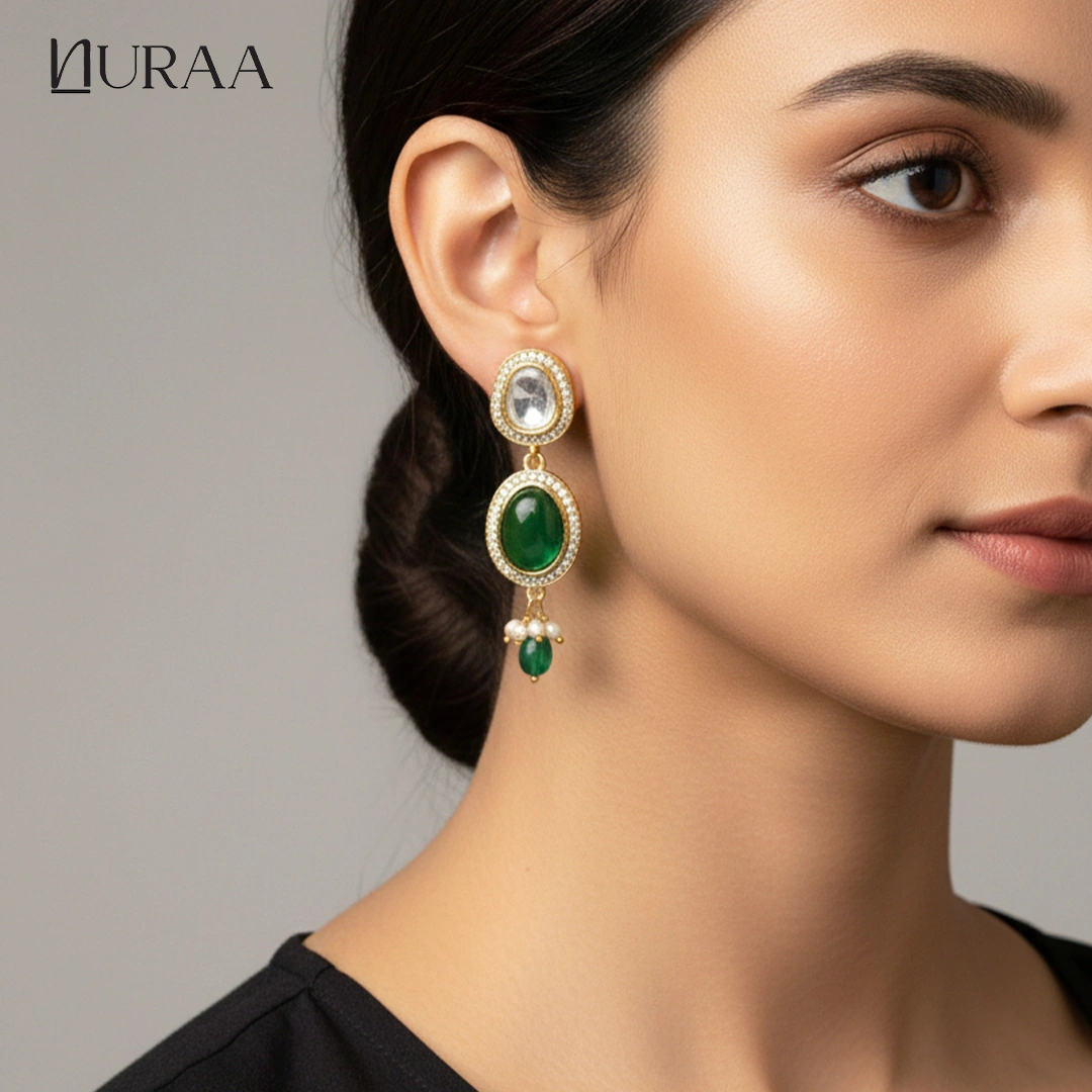 Zoya Polki Emerald Drops by NURAA, feature a classic uncut polki top paired with a rich emerald-green stone drop, framed by delicate sparkle zirconia detailing. Finished with soft pearl accents, the design blends royal charm with modern grace. Perfect for those who love statement pieces that are refined, timeless, and effortless.